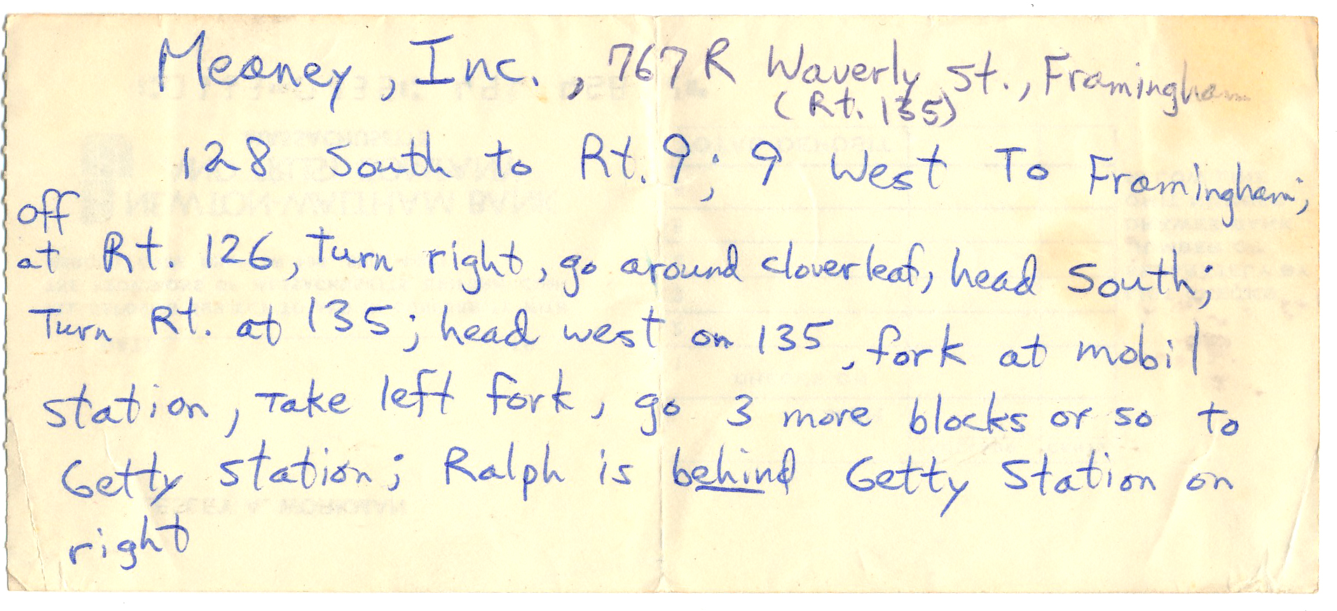 Way back in the mid 70’s.. The guys working for him scared the shit out of me by telling me things I needed and the cost. Ralph’s engine builder. Don took pity on me and told me to come to HIS Shop on the orher side of Framingman and he took care of everything with no charge. We have been friends since.. He did retire to Nova Scotia a few years ago but we are still in contact occasionally. I have gone to a total of 1 PCA Event back in the 70's.. The 914-6 people were treated as if we were lower than whale shit. There was 1 nice guy ... His last name was Houseman, gave me the directions to Ralph's shop on a scrap of paper.. He was 1 of the owners of H+H Specialties that made the sway bars that are still on my car today. I drove to his house and bought them.. Here is are the directions.. Funny the stuff you hang onto |