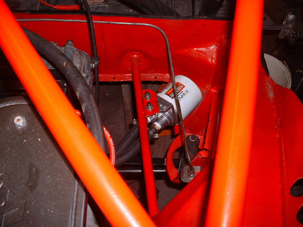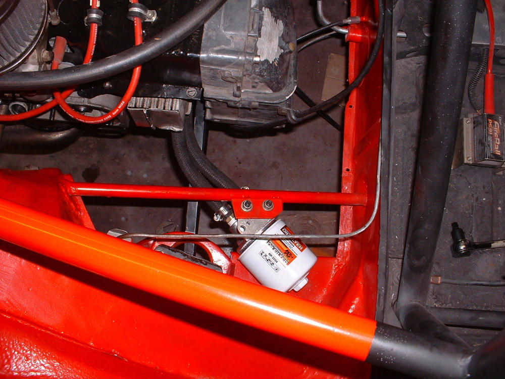 Due to the full flow pump, the oil filter needs to be relocated. So I wanted to keep it close to the engine but easy to get to. So after much thought and trail fits, I decided on this. (see pic) To get it on and off I unbolt aluminum mounting bracket from the angle that is welded to the tubing. I can than spin the filter on/off without spilling a drop of that very $$$ Royal Purple racing oil. BTW, the tube is supporting the inner suspension ear.