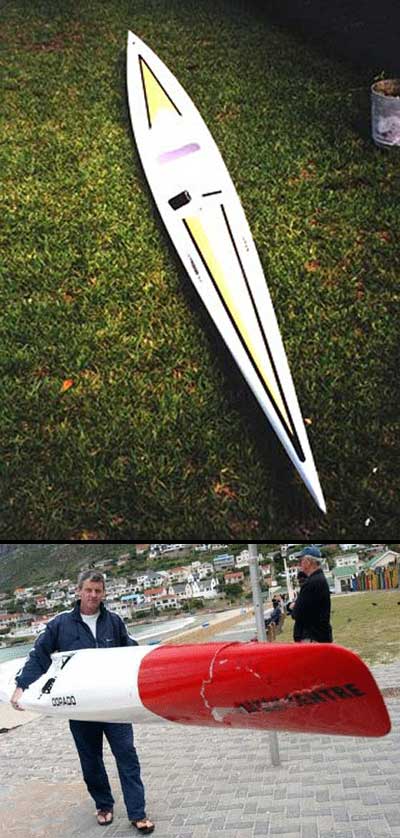 I'm talking a about a surfski which is basically a long narrow (19' x 18") ocean going kayak. I want to redo the hull like in the lower photo, all white with a red bow entry. BTW, that ski was cracked at the bow by a great white off the coast of south africa just last week. The guy was able to get back to shore without being eaten (IMG:http://www.914world.com/bbs2/html/emoticons/unsure.gif) We just have manatees down here (for the most part), they are big but real slow and kind of cuddly. Attached thumbnail(s)