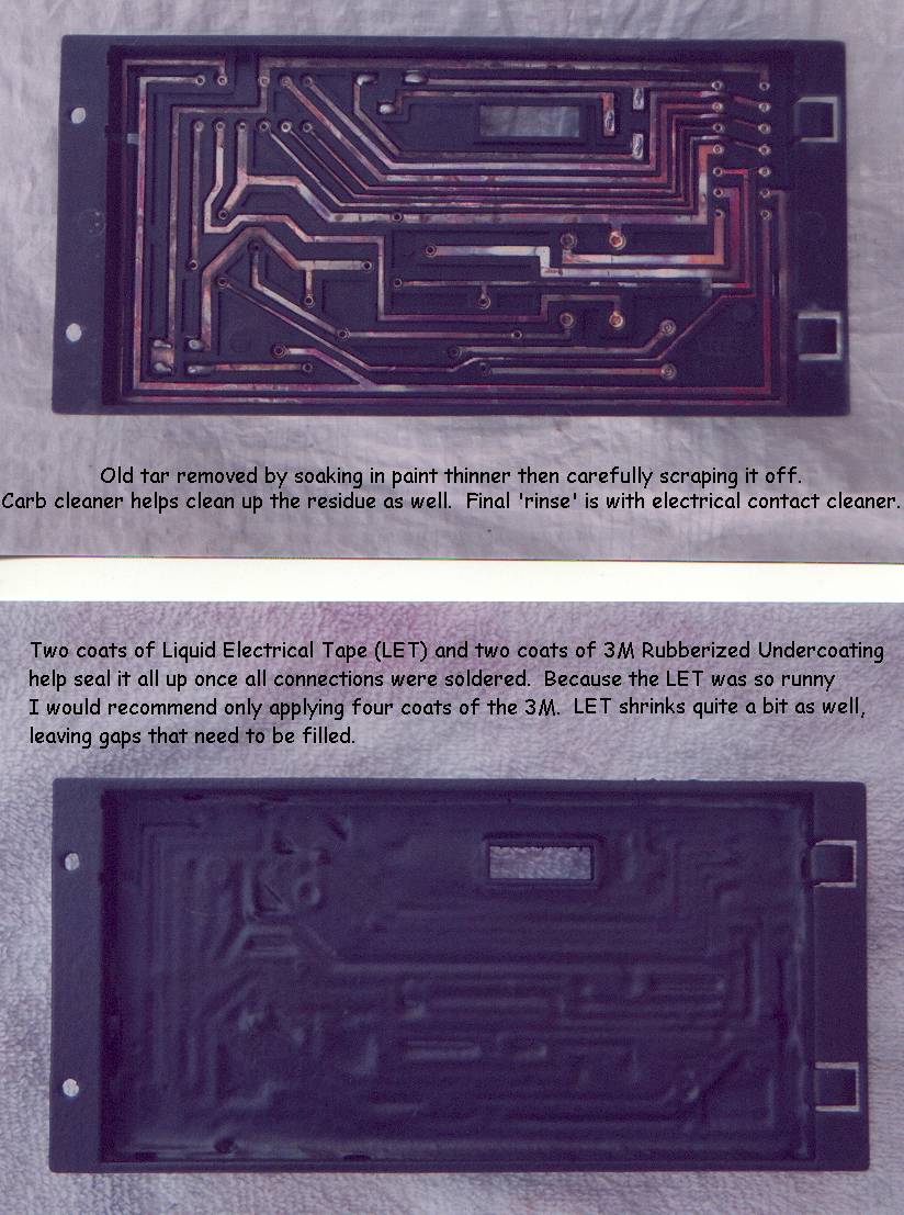 (IMG:http://www.914world.com/bbs2/uploads/post-2-1063733351.jpg) Mine showed only a couple cracks in the tar bottom and I'm sure I could've easily patched them but I wanted to see if recoating was easy. It is, just messy and I recommend wearing nitrile or latex gloves. The LET shrinks considerably. One container will be more than enough for two coats and left overs for later wiring projects. The 3M undercoating sprayed on easily and did not shrink. Several coats of that would probably be fine. I hesitated using RTV because I thought I read somewhere that it may be slightly acidic on some metals and I didn't want to risk having my copper strips and soldered joints disappearing on me one day while driving. If anyone else has done this differently I would like to hear about it, be is successful or not. Mine was successful (short term at least (IMG:style_emoticons/default/wink.gif) ) as the car started right up and ran after installation. Will it last for the years to come? We'll certainly find out (IMG:style_emoticons/default/beerchug.gif) |