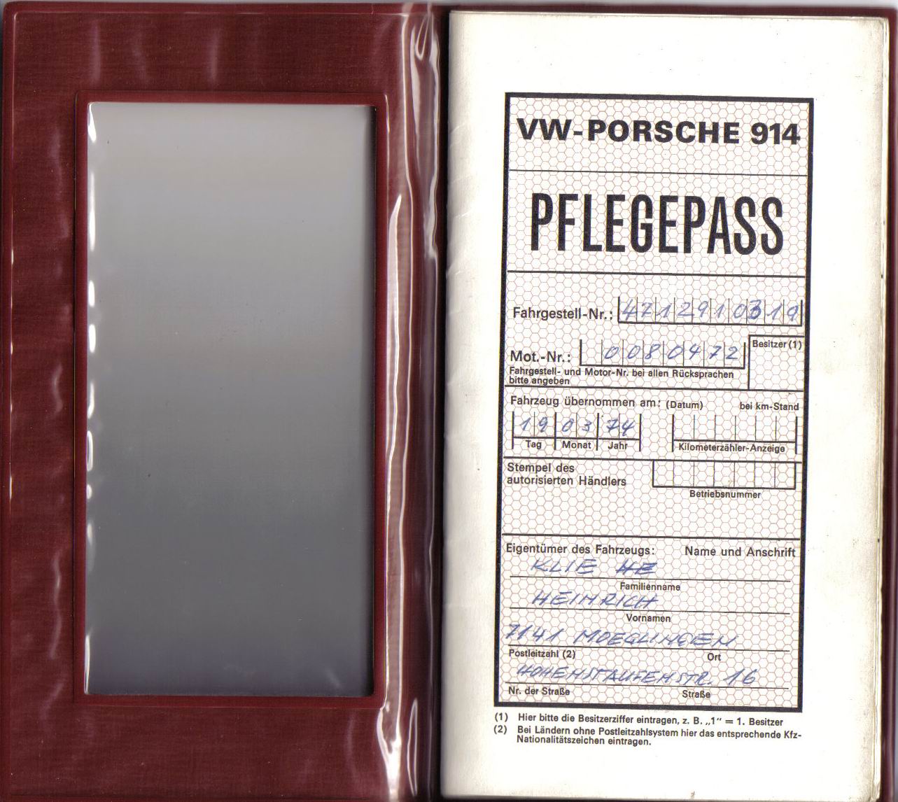 Here is the maintenance book with the VIN so it's a fairly late '71 ... VIN: 471 29 10319 remember that europeans write the 1 like you guys write a 7, and the 7 always with a horizontal line, so don't get confused there ... Engine #: 0080472 the dealer started this maintenance booklet on "03/19/1974", the owner is listed as "Heinrich Klie" ... (IMG:style_emoticons/default/smilie_pokal.gif) Andy |