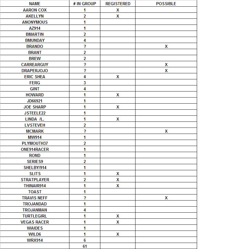 I can't even read it, anyone know why it's so pixelated (sp)? Saved as a JPEG... Very cool we have 61!!!! Now go get your damn rooms.. (IMG:style_emoticons/default/biggrin.gif) Noboday is paired with anyone in this list. I know it appears that way, something is wrong with the file. This list is simply showing all those that have committed, (said they were going) and those that are possible's, and finally those that have filled out and submitted their registration forms... This is simply a basic guide line of who is coming and who is not for a general head count... Now if you would like to partner up with the Hosemeister, then you will need to talk with him.. What happens in Moab, stay's in Moab... (IMG:style_emoticons/default/laugh.gif) Attached thumbnail(s)