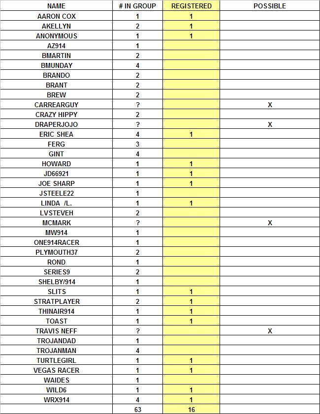 Guess i'm gonna have to make a run to Costco now and pick up a flat of this (IMG:style_emoticons/default/biggrin.gif) (IMG:style_emoticons/default/lol2.gif) Just noticed on the first page that the current number of hotel rooms reserved is 25 !!!! (IMG:style_emoticons/default/boldblue.gif) (IMG:style_emoticons/default/girlboing.gif) I think those rooms are just reserved, I don't know that they are paid for yet.. (IMG:style_emoticons/default/confused24.gif) We are however based on my count at 63 people committed verbally .. Updated list.. Attached thumbnail(s)