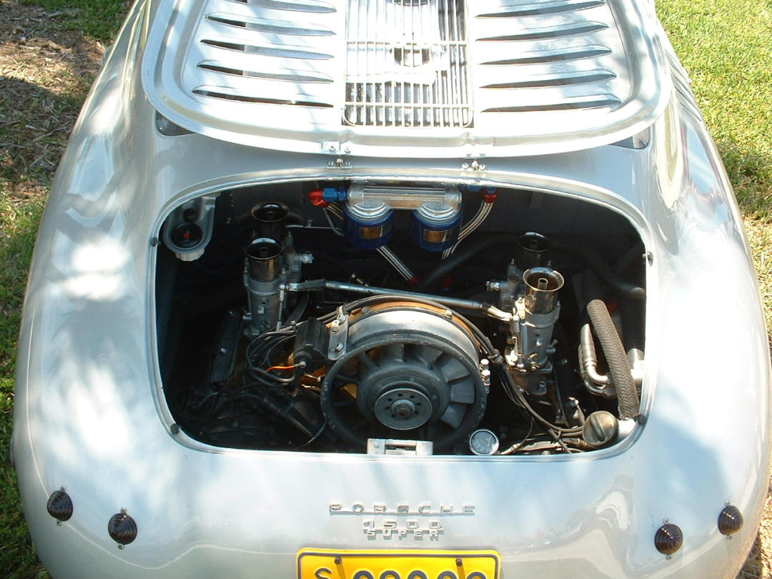 This is the 356 with the 4 cylinder 911 engine in it. The car was built by Gary Emory about 4 years ago. It was written up in Excellance. It's 1500 cc and he says it has 160 HP. Body is all steel and weighs 1700 pounds. Owner says he's had it up to 150 mph.