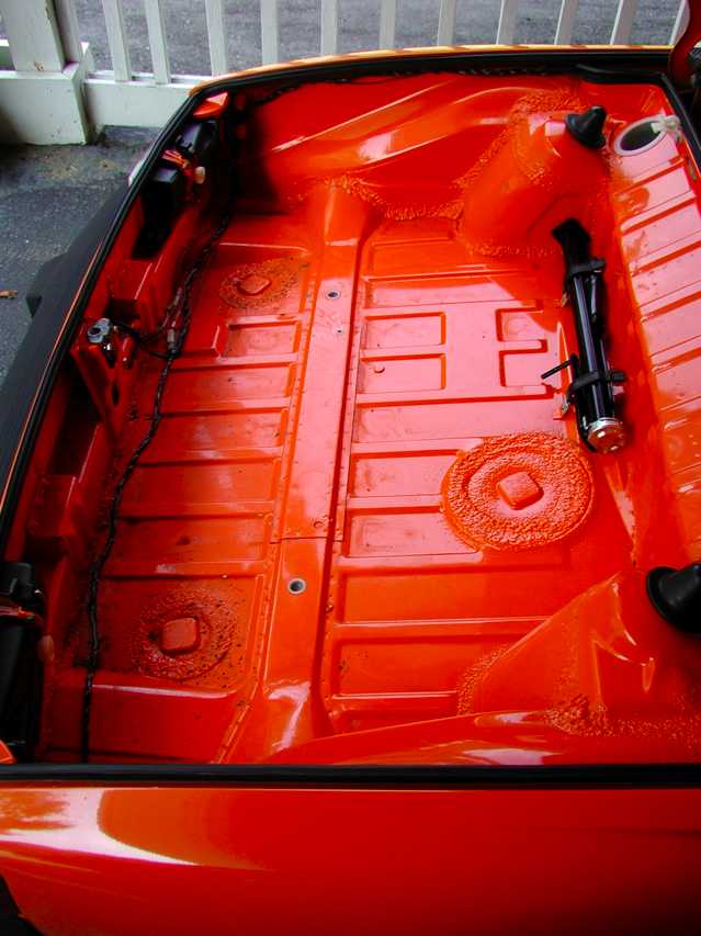 same Scarlet (Mars) Red car. check out the condition of the 2 white floor plugs. the rear trunk pad and carpet are as new but not pictured. boner. k Rhody, VERY nice finish! I'd guess that yours is a late '72 or later car. But, what's with the rear lighting wiring? Should be tucked away up in the taillight/lock asembly area. |