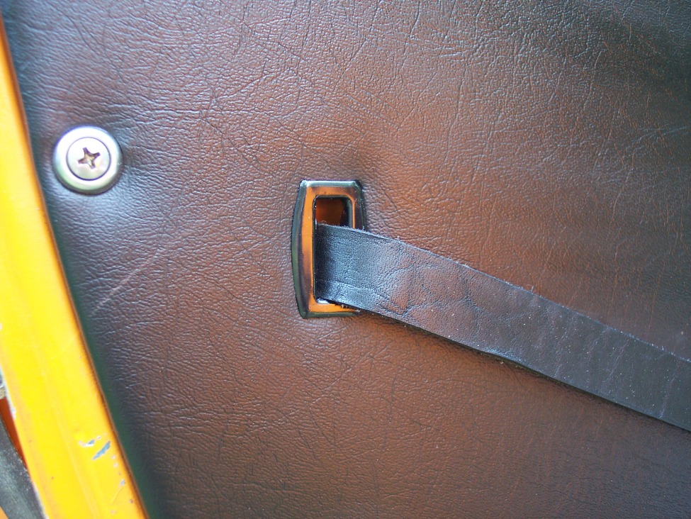 I got the confidence,following Aaron's thread,as he made it seeem soooo easy.Yeah right. Well Aaron,the recover went real well til I got up to the tuck & roll.It kicked my A@* so bad,I threw in the towel,and let a local upholster finish the job. I initially got 2 sets of door pulls to compare prices.Cheapest was from fiatparts.com 20 bucks for the pair. The leather door strap was made by a local leather guy,6 bucks for the pair. Finally,the bezel for the door strap I copied from AJ's site cause he actually has measurements for it.I lasered it here at work,and made a forming die to hammer it's shape. Not a lot in it,but at least it is finally done. Anyway,Aaron's thread is a really good one.Thanks for writing it. Ron Attached thumbnail(s)
