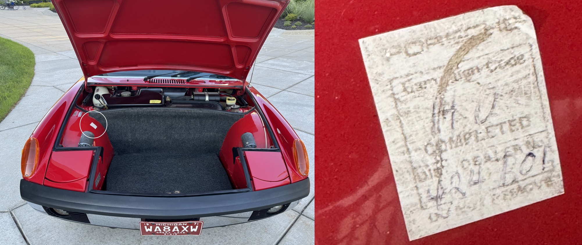 Hello all: Searching this thread, I saw a dealer sticker like this one from my '72. What do the codes mean, and what does the printed text say (I can read most of it, but want to be sure). Is this where these stickers were usually put? Thanks! Steve 1972 Porsche 914-4 Can't say definitively but I think that is a sticker verifying the "HO" recall? https://bowlsby.net/914/Classic/Recalls.htm |