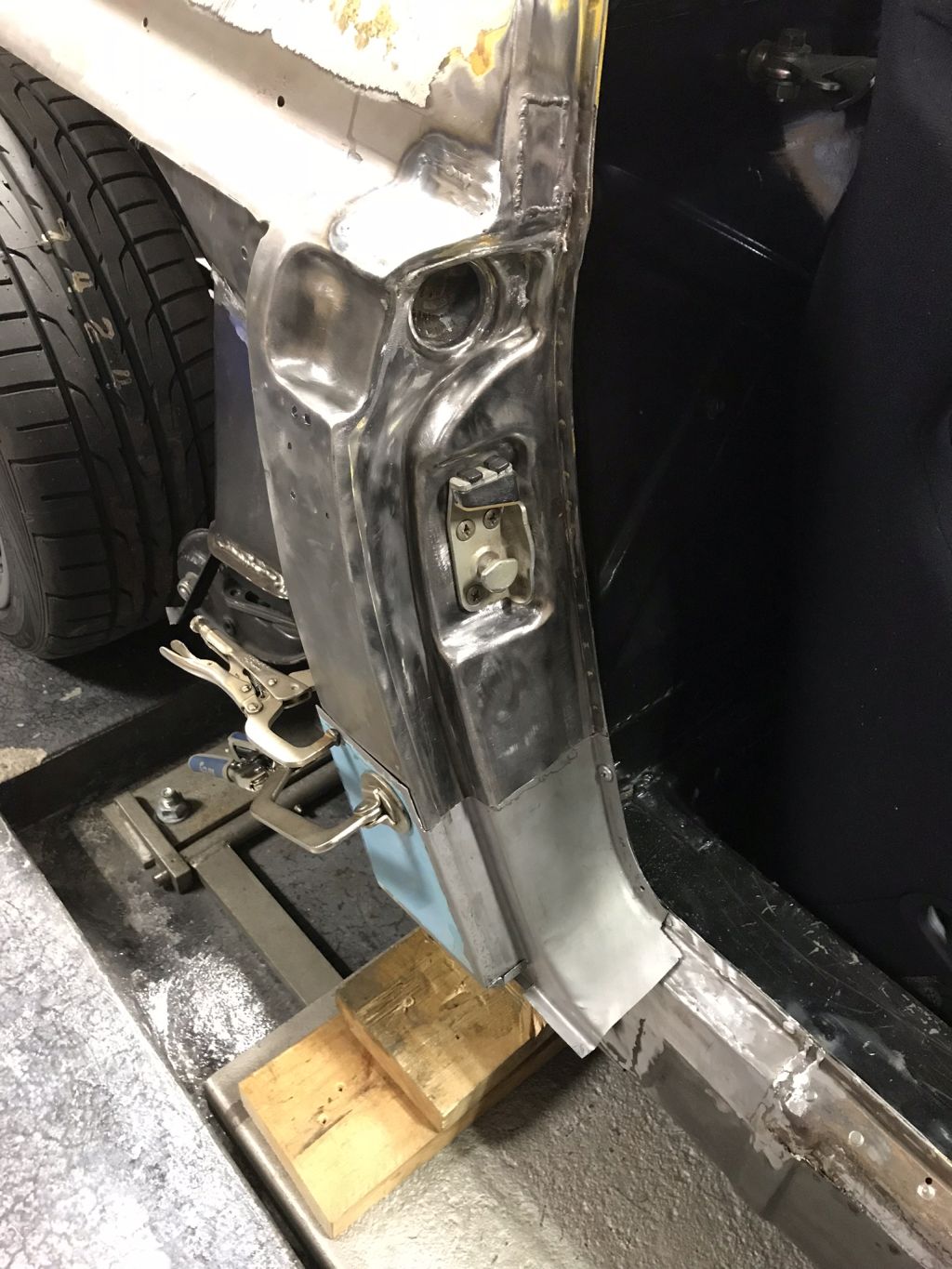 On with progress. My Father is again planning to join the trip this year as he was last year until rust and the sins of the PO resulted in the complete removal of the fenders. He is quite experienced with car projects and agreed to come down with my Mom to give me a head start on this year's push to drivability. Over 4 days we probably put in 50 hours of solid work, Mom even helped! The goal was to get the rear fenders bonded on but ended up just a bit short but took the opportunity while we had access to fix a few other issues. Lots of smoothing of welds from previous repairs and the never ending removal of undercoating and paint. ![]() One of the unexpected repairs was a rusted out drivers side latch bracket. Would have been easy to order one from Restoration Design but no time for that so cut/weld. Still fits. You can also see several unneeded holes that we welded shut. ![]() The patch panels that I picked up for the project were really nice but had a couple of soft spots that needed to be repaired. Just a few angles here to sort out. Turned out pretty well. ![]() Panel fitted and a patch at the top of the door latch relief formed from flat. That took almost 2 hours! My Father asked if I was gong to make a career out of that piece. Two areas on the driver side need small patches along with complete replacement of the bottom. Part was make from a Restoration design panel and the rest formed from the bottom of another fender. Also cut out and repaired what was left of a rusted out jack pad. No pictures but it is slightly visible. Such an insane amount of work just to get solid medal to bond the fiberglass fenders to. I have another 4 day weekend scheduled for this weekend. Should be able to finish up the rear and get the fenders boned on. Front is next. Full steam ahead. |