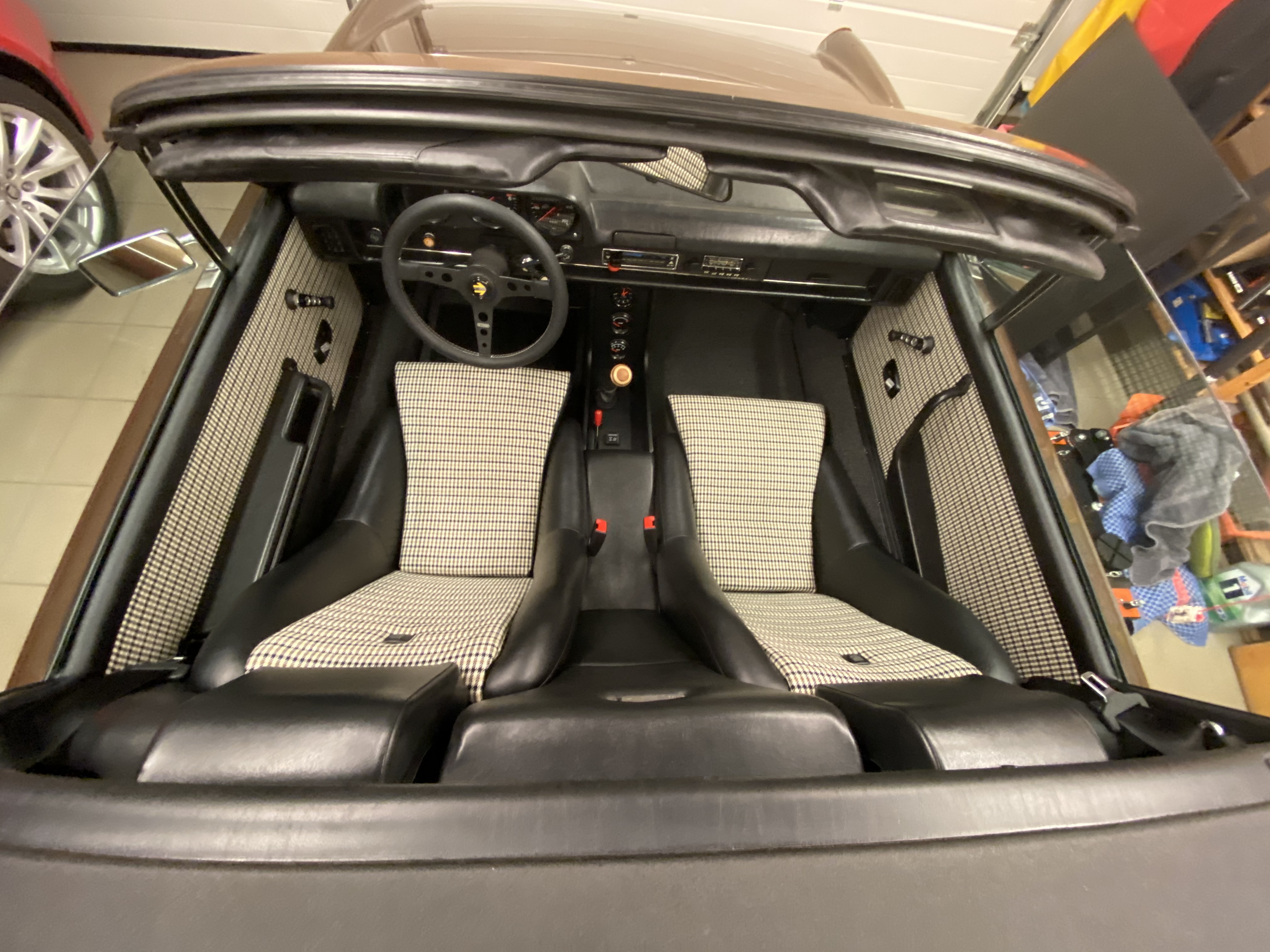 PO owner of my car was lucky enough to score a nos brown interior back in the day. Unfortunately he installed speakers in the doors, otherwise it's perfect. I'm a big fan of the brown personally. Very nice car but the wheel and shifter ruin the interior Shifter has been changed to a rennshift with a 917 knob, but the wheel has grown on me. I really like the larger size and grip. (IMG:style_emoticons/default/beerchug.gif) |