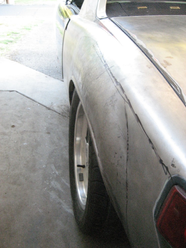 before I left I bought 16x6 and 7's and found that some stretching would be necessary in the rear. I have always liked soft flares anyway... but as follows is 1) as delivered 2-4) stripped and pounding started on the rear fenders Attached thumbnail(s)