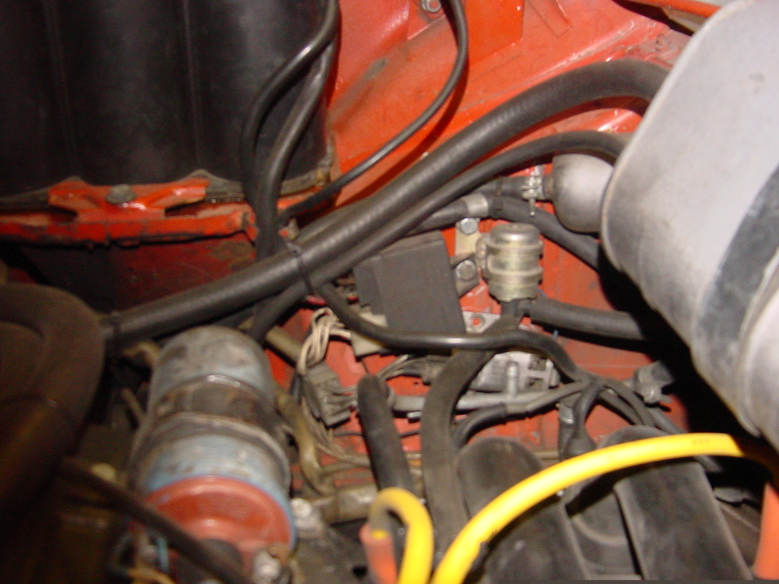 I can take pictures of Betty's 74. It is not completely original, I have replaced all the hoses with ones that don't have the cloth braiding on the outside, but everything else is in the correct location. And it has AC on it, so some of the components were moved to accommodate the AC install. I will take them tomorrow and post them. A/C pics would be great.. I did get hooked up on some...... But a few more would be grand..... Thanx from the 914GeeK |