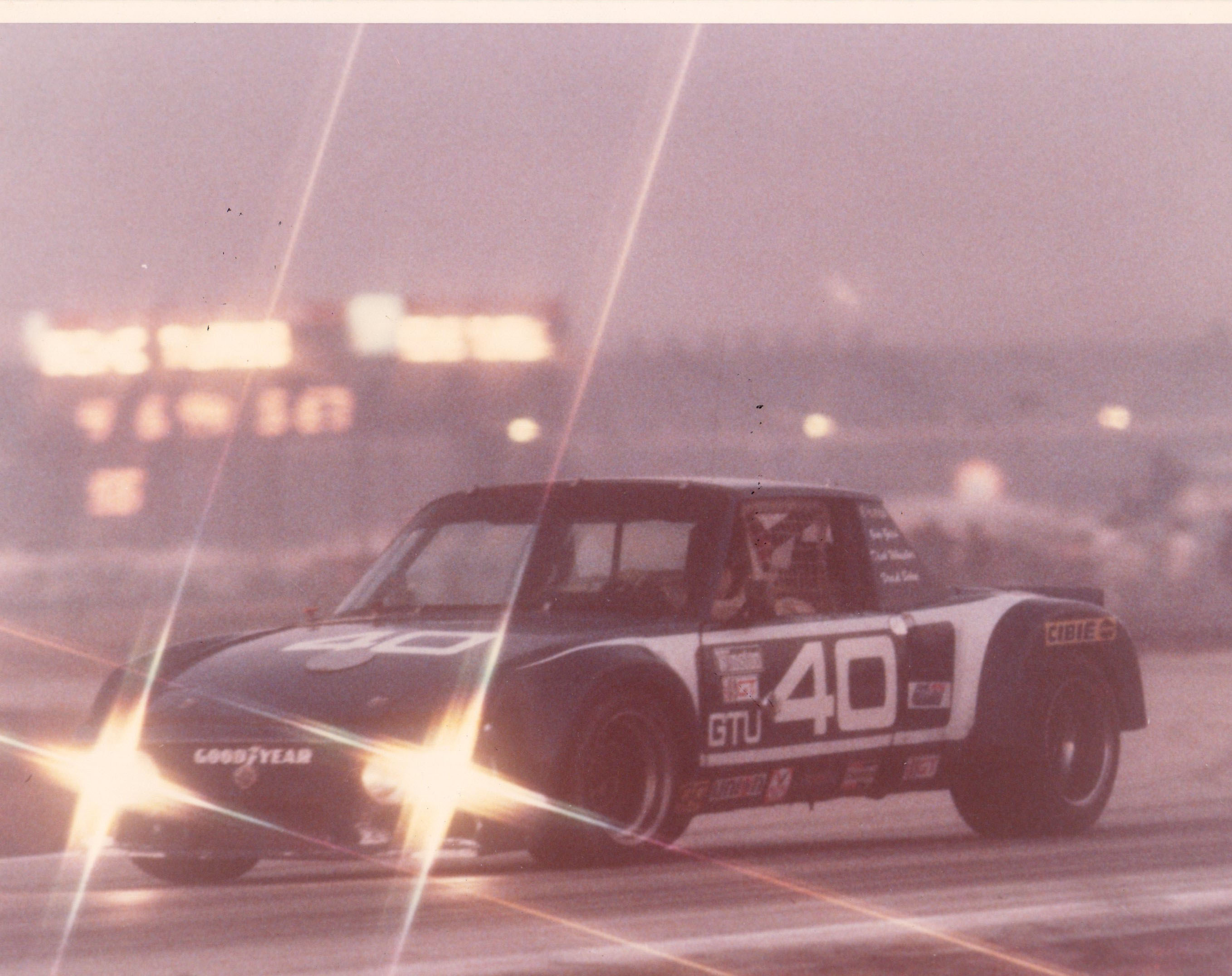 The cars had the early R 7x15 wheels with all the backspace to the back. Those wheels are very rare and expensive today. Since the cars were delivered with either 14 or 15 wheels you could run either one up to an inch wider than delivered. SCCA's GCR's (general competition rules) allowed that. They also allowed windshields to be removed and replaced with a windscreen. BUT the windscreen had to start where the old windshield started and couldn't extend beyond the rear of what it was replacing. Hence the long windscreen that was on the cars. It came rearward to the point where the windshield met the top. Again per the GCR's. Not only that it looked cool. SCCA racing back then was all about reading between the line of the GCR's. If you could do that you could gain an advantage. As far as the removal of the windshield it does lower the weight and it does cut down on frontal area. I don't know how much but I can relate some noticeable results that occurred. The first 914 I ran at Daytona in 1976 lost about 5 MPH on the back straight when we put the headlights up for night driving. You needed all the light you could get then because none of the track was lit up like today. Also there was no chicane in the back straight so you lost a bunch of time on the banking. Then the rules got a bit more liberal and we could put headlights in the front spoiler behind lexan. See picture of lights at Daytona in 1979 |