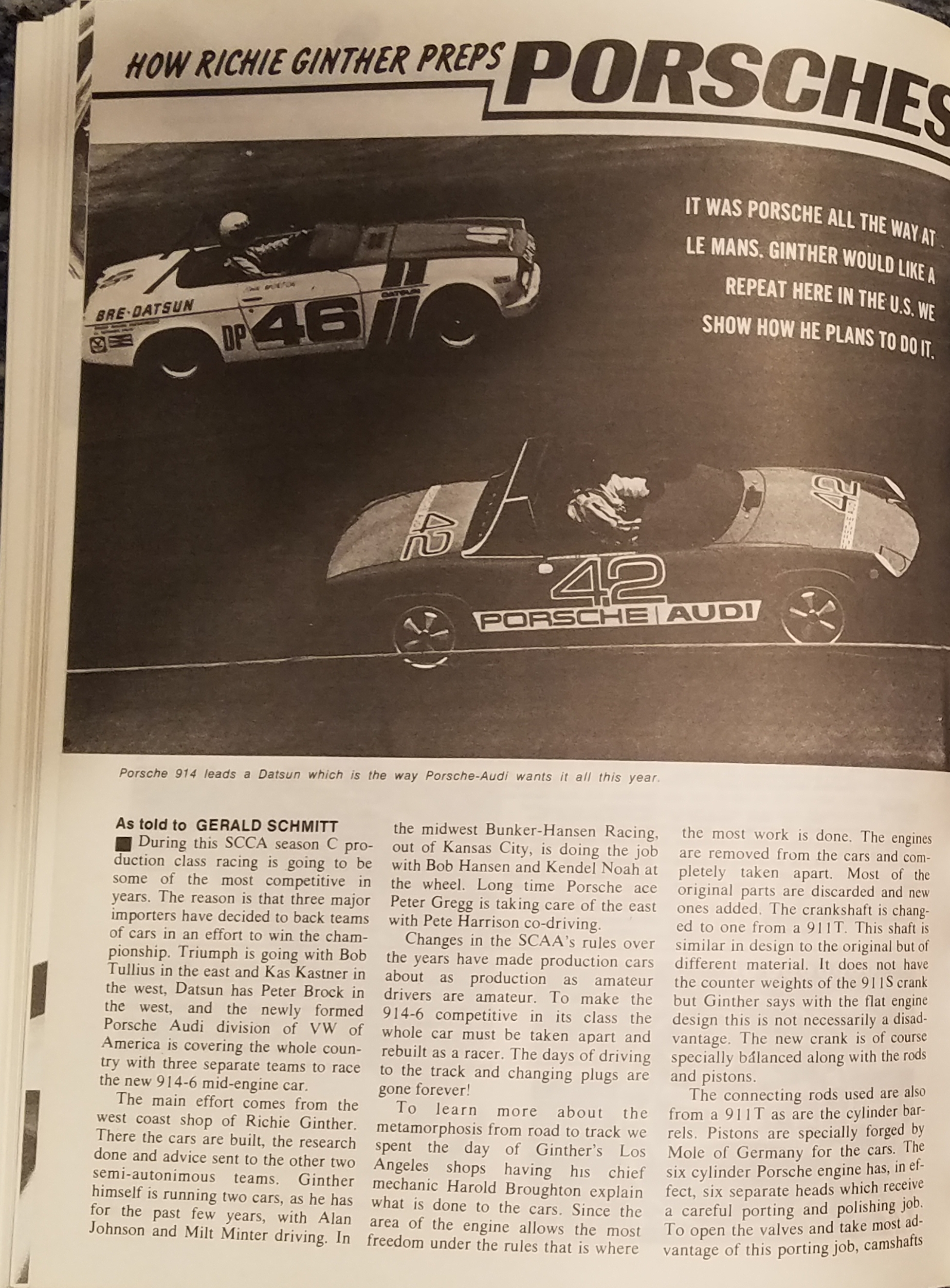 Hi my name is Bob from Santa Barbara Ca I worked at Schneider Autohaus for over 20 then the dealer for 10 year I am new to 914 world I am Happy to say the #30 914-4 is still alive but it is not the same as when it raced I bought it from Jim at Schneider some 30 years ago who got it from Rod Harrison who bought it from Dwight. Rod raced IMSA way back then and bought a factory 914-6 to campaign he needed a back up car and converted the #30 car to look like his factory 914-6gt. I raced it in POC for over 15 years first with a 2.0 now 2.7 back then no one really knew what a Richie Gunther car was or cared the good new was I never got in any big accidents. How the car is now the body is 914 Sheridan 2.7 roll cage is like a 914-6 10in wheels 5 lug side shift transmission fiberglass front and rear hood doors bumpers fenders . My last race was at Laguna Seca where I hit a cone when the car looked like a 914-gt after that I changed the body to Sheridan and never painted it .I have been a Porsche mechanic all my life and was hoping to one day bring the car back to its glory at this time the car sits in front of my house and is turn key ready to race I will post picture when I get a chance cheers Bob