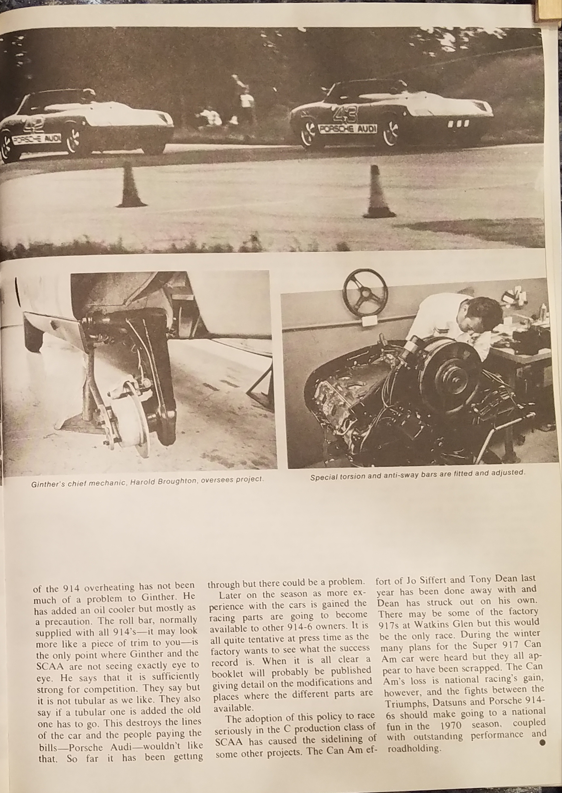 Hi my name is Bob from Santa Barbara Ca I worked at Schneider Autohaus for over 20 then the dealer for 10 year I am new to 914 world I am Happy to say the #30 914-4 is still alive but it is not the same as when it raced I bought it from Jim at Schneider some 30 years ago who got it from Rod Harrison who bought it from Dwight. Rod raced IMSA way back then and bought a factory 914-6 to campaign he needed a back up car and converted the #30 car to look like his factory 914-6gt. I raced it in POC for over 15 years first with a 2.0 now 2.7 back then no one really knew what a Richie Gunther car was or cared the good new was I never got in any big accidents. How the car is now the body is 914 Sheridan 2.7 roll cage is like a 914-6 10in wheels 5 lug side shift transmission fiberglass front and rear hood doors bumpers fenders . My last race was at Laguna Seca where I hit a cone when the car looked like a 914-gt after that I changed the body to Sheridan and never painted it .I have been a Porsche mechanic all my life and was hoping to one day bring the car back to its glory at this time the car sits in front of my house and is turn key ready to race I will post picture when I get a chance cheers Bob (IMG:style_emoticons/default/beerchug.gif) (IMG:style_emoticons/default/welcome.png) thanks for filling in the story, can't wait to see some current pictures- and some vintage as well. ! |