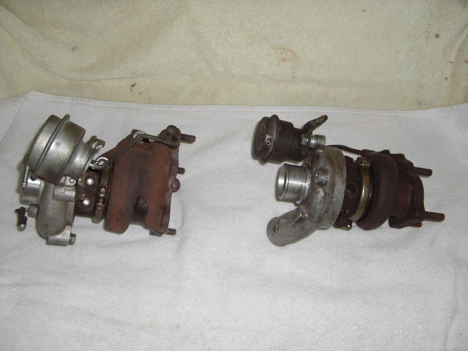 Turbo- I noted that I had changed from the WRX 13G to a 3000GT 9B turbo. I guess 35 yr old 2 valve pushrod technology really doesn't flow as well as the 4 valve DOHC stuff we have in the newer cars. What I really needed to do was know exactally the flow rate of the heads of the 914 so I could compensate the formulas to determine the correct turbo sizing. Here are some pics of the difference in size of the WRX and 3000GT front turbo: