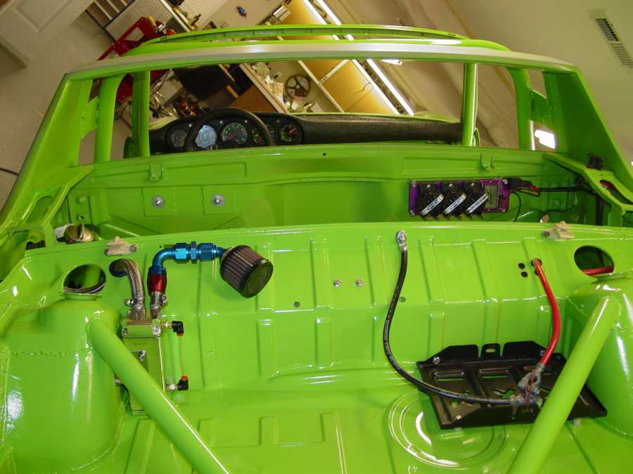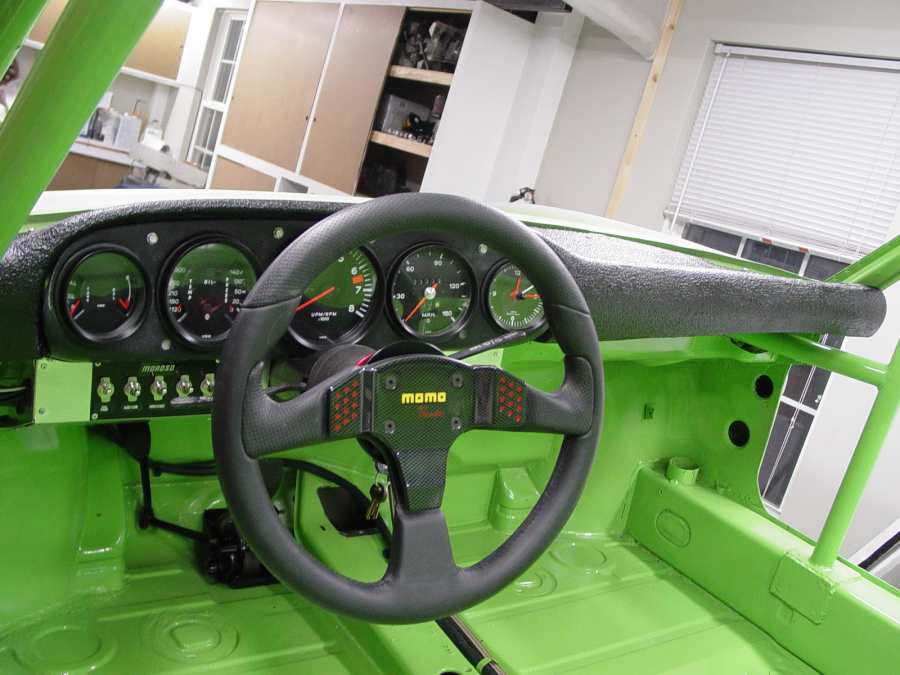 - things not pictured are wiring the tank and fuel pump, also installed the sub belt eye bolts..... DONE -wired the HPV ignition, interestingly enough the relay for my hot start kit worked for the relay on the HPV....WHO KNEW??..... DONE -finished plumbing the fuel line to the rear of the engine bay.....DONE -installed the oil catch tank and plumbing.....DONE -installed the steering column and the momo adapter and the quick release, greased all bearings cleaned ETC ETC ETC...smooth as silk now....DONE -installed 911 dash and built the lower cover panels as well as installed the Moroso OVER PRICED fricken 5 switch panel.....DONE |