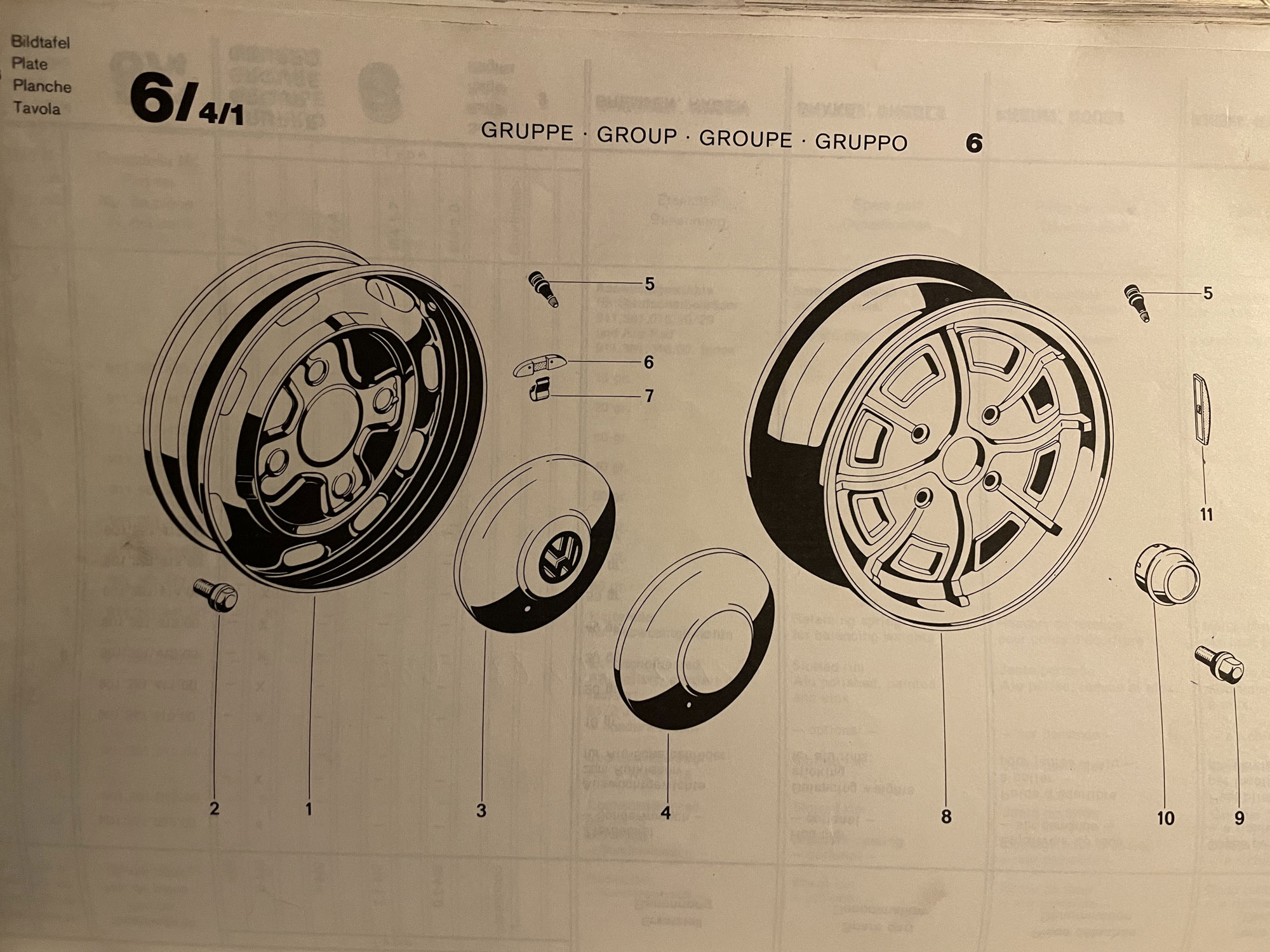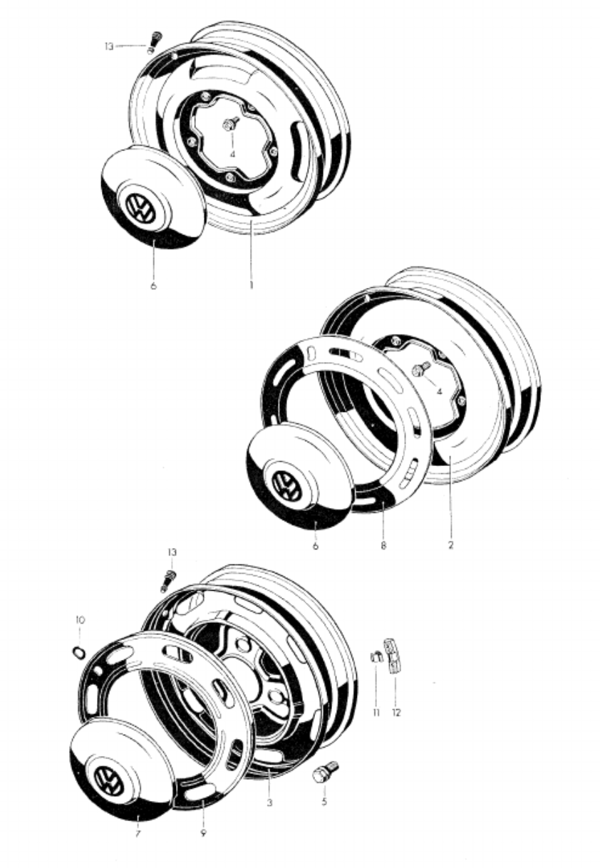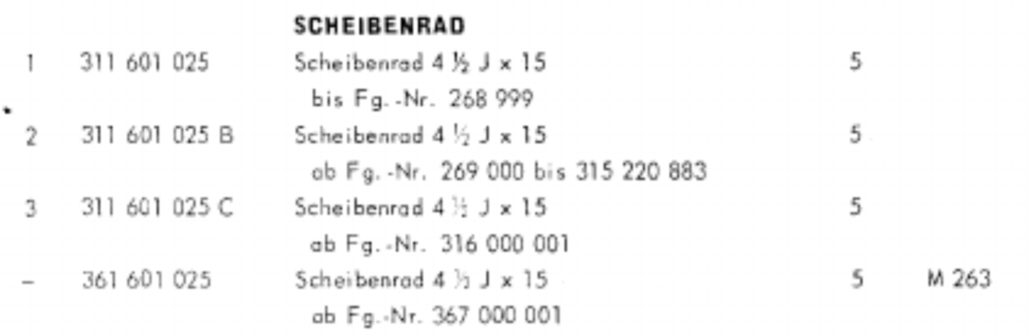 no - i don't have vintage parts manuals. so you can't quite figure out if they are talking about what ultimately supercedes and what was original at the time. i think i have had the same exasperating experiences as you trying to figure it out. i think the parts manuals on the VW classic site in germany that you can access are actually period pieces from the time. and the 914 ones you can download are updated into the early 21st century. they don't have 914 parts catalogues on the VW classic site. its a nightmare picking through it. you even wonder if VW just stick up some stuff on their site for mere convenience. and the catalogues are the german ones - so don't cover USA market. i'd love to be able to pull down an aus market parts catalogue, i know they existed. but try and find one. i've got no idea what a J update on a type 3 wheel would be. but i do think that you are right. the narrow wheel 914s were running type 3 steel wheels and so did 411 and 412s. (IMG:style_emoticons/default/confused24.gif) what i do know is the offset on the star steelies on the 914 is different from the star steelies on the beetles in 1974. in fact the beetles offset it out to give a wider wheel appearance than the 914s. the germans were all over the shop as we say in australia.\ going back to the wheel spare part no. the type 3 wheel is always called a 311 601 025 and in the beginning that is actually that primitive 5 bolt wheel. by the time you get to 311 601 025C - thats when it turns into the 4 bolt wheel for the disc brake front end with vent slots around it. classic vw late 60s wheel. and then they just keep adding D E F G H I and "J". because somehow they keep doing little mods to it. whatever they are. so the 914 gets the 311 601 025 J. and i have no idea why that is different to 311 601 025 C. but main thing is it is still a type 3 wheel and they just keep bolting it on. type3 s, type 4s and 914s. (IMG:style_emoticons/default/blink.gif) so bringing up radials and tubeless tyres. yes, you are probably right. but i would not have a clue. but there must be little things they do. what they are, i do not know. Ah, nice! I didn't realize the German Classic Parts site had "Ersatzteilkataloges"! After looking at the type 3 one, I realize the "TL" and "Variant" at least do refer to Type 3's — I'm still a bit confused about the name of type 3's, like they call a notchback a "1500" (which is an engine size I would think), a squareback is a "variant" and a fastback is a "TL". Here's the listing of the wheels in the type 3 catalogue 1 and 2 you can see are wide bolt pattern in the pic So 3, which is "C" part number and the "–" are the ones. The "–" means not pictured and is for M 263 which ocr traced and translated is M 263 powerful truck mounts for required payloads 361-388 from chassis no. 367 030 001 316 000 001 is august '65. They don't list 367 030 001 specifically, but it's between August and December of 70. That catalog only goes to the start of the 72 model year and type 3's were produced until 73, so there's some info missing, but it is helpful. I got pretty good at interpreting the catalogs when I did the "Sliced Bread" bus part finder site. |