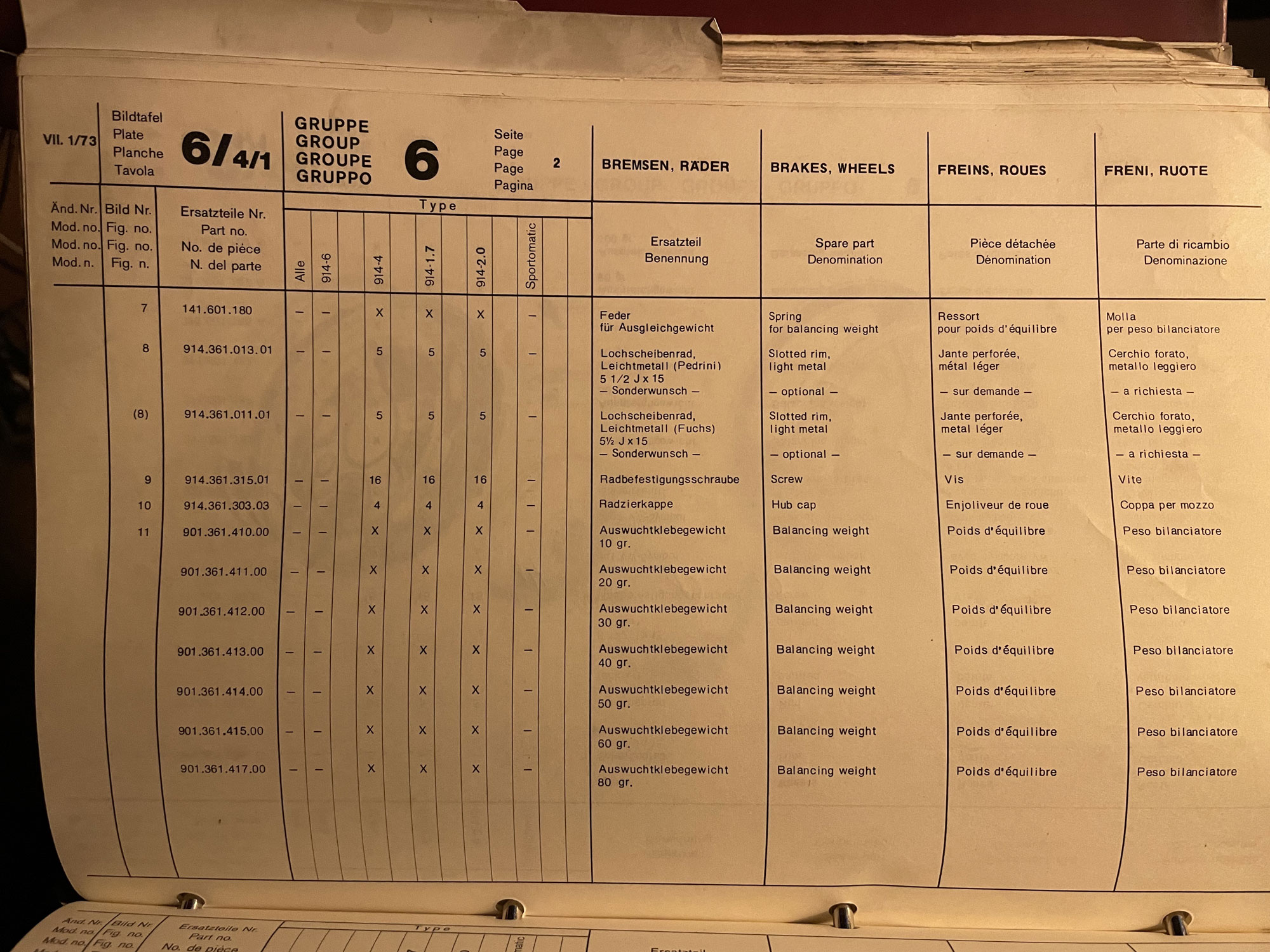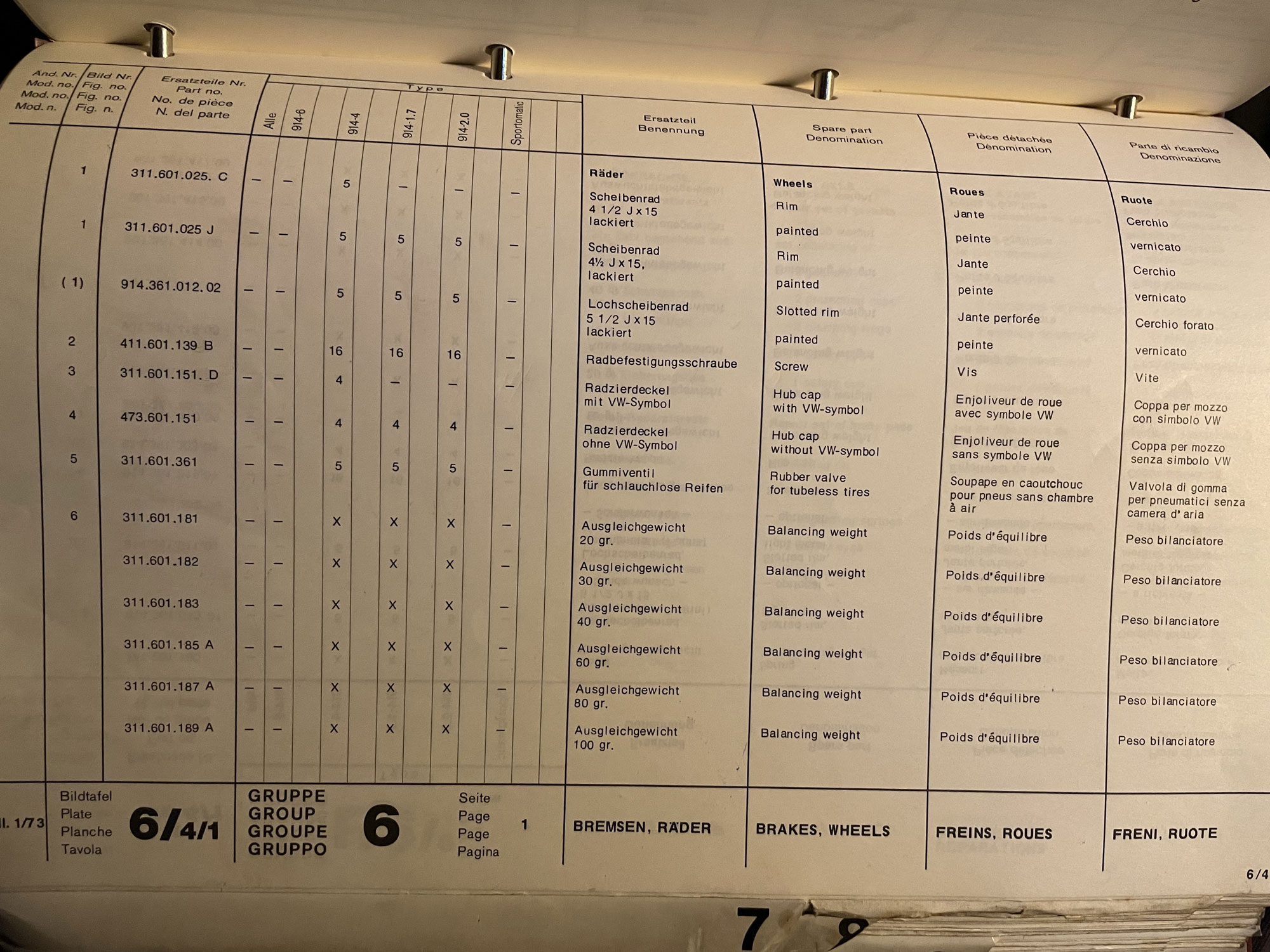 It's not as good as I'd like — the VW parts catalogues have like bolt sizes and more info generally. Still it has some interesting info. Here is the only 4 lug wheel illustration. It's weird that they only show a Pedrini and it's dated 1/73 which would be up to 73 model year. They have the 2L Fuchs in the description, the second #8, but not the 4 lug Mahles which I thought they did have in 73. Anyway it turns out there IS a "J" version — so weird they skipped every version from C until J? Seems the C version was available previous to 73 model year when they just had 914/4, and then they got the J version once they started differentiating 914 1.7 and 914 2.0 which was I think 73 my. I was thinking that may be when they started making the wheels hub centric, though I thought that was just the alloy wheels — perhaps the change was for that. |