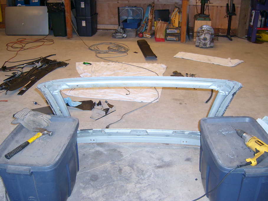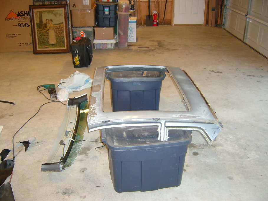 Here is a better shot showing more of the material removed. I must of drilled out 1000 spot welds, ground down and cut off gobs of metal trying to leave as much alone as possible to retain strength. You can also see some 944 interior parts laying around. I went through I think about 5 versions before finally settling on the final one. Oh yeah, the finished top with sunroof in and all interior parts wieghs 6lbs more than the glass top, I figure with welding and skim coating(body work) max of 10lbs added to the car.