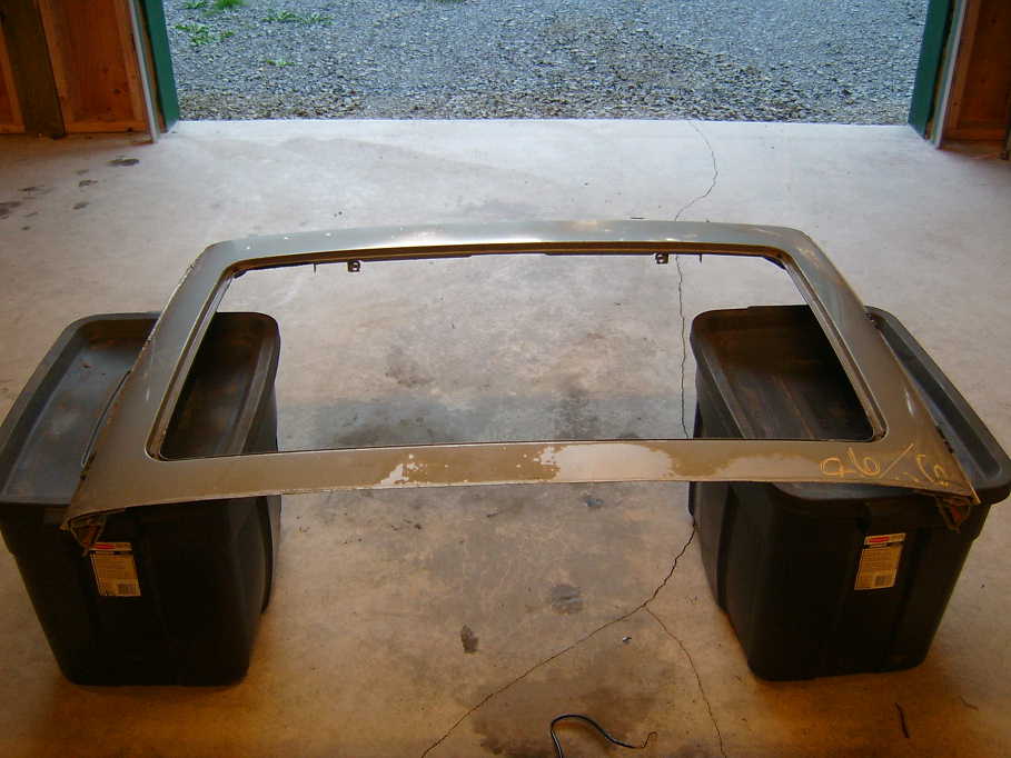 The first thing I started with was a handful of measurements and compound curve demensions. Then my son and I zipped on down to a local bone yard and started checking out roofs on various cars. I wanted to keep it in the "Porsche family" or at least in the P-VW-Audi family, so we started there. Turns out, the 944 has an almost spot on match to the first main raidus required for the job. Hmm, $100 and a sawzall later and we had the top of a 944 sitting back at the house. Here is the basic starting piece I had. This is where the fun and frustrations began. (IMG:style_emoticons/default/wink.gif)