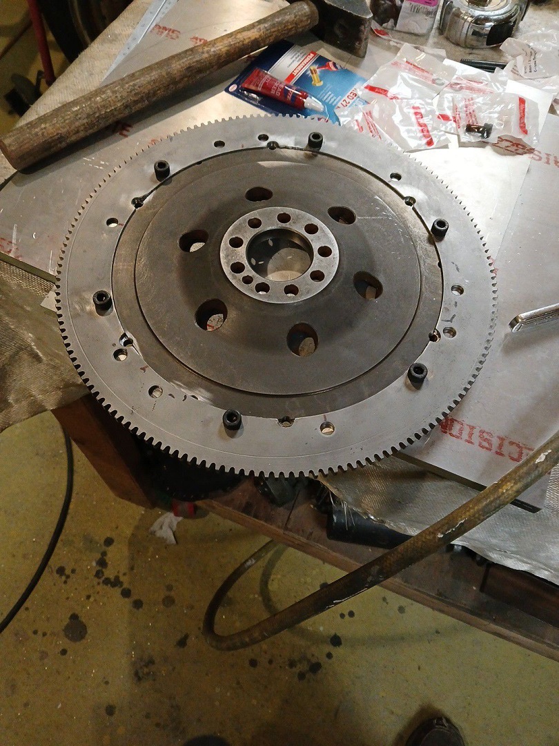 So I sourced a start mount and starter first. BTW Pelican is crickets and Rennlist has some great guys and others make posts that could seem like insults if you don't have a thick skin. I fished for information on both sites. in my usual impatient manor I jumped in the deep end and just started buying used parts to get an idea of ring gear spacing and clutch size. I purchased a 928 Auto flywheel shown above. My thought was to use the ring gear on the custom flywheel I already have. But then I purchased the 928 manual trans Flywheel with a single dis clutch and pressure plate used from a salvage yard in PA. when it arrived I was both disappointed then elated. The flywheel is actually the clutch disc surface and the trigger wheel for the ignition. The pressure plate is the massively heavy contraption that bolts the the trigger wheel and has the ring gear attached. I will be sending this off to the bin. On the other hand the Auto flywheel has the ring gear attached and is the correct distance away from the block for the use of the 928 starter. I decided to set the 928 manual trans flywheel with trigger wheel on top of the auto flywheel. The match up was perfect. There is a slight step on the face of the auto trans ring gear. The trigger wheel dropped into the recess perfectly. So this will be the foundation for the next flywheel. |