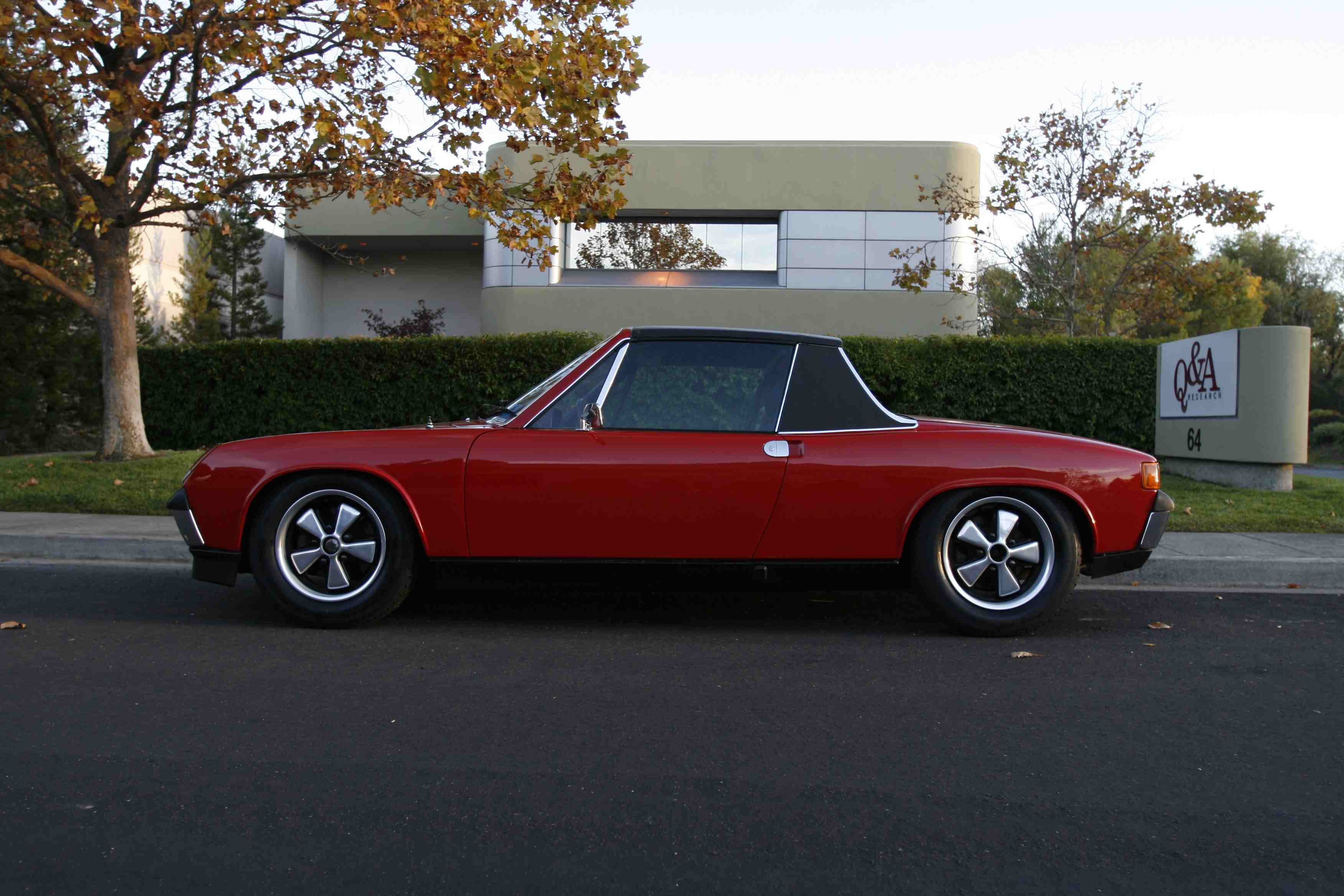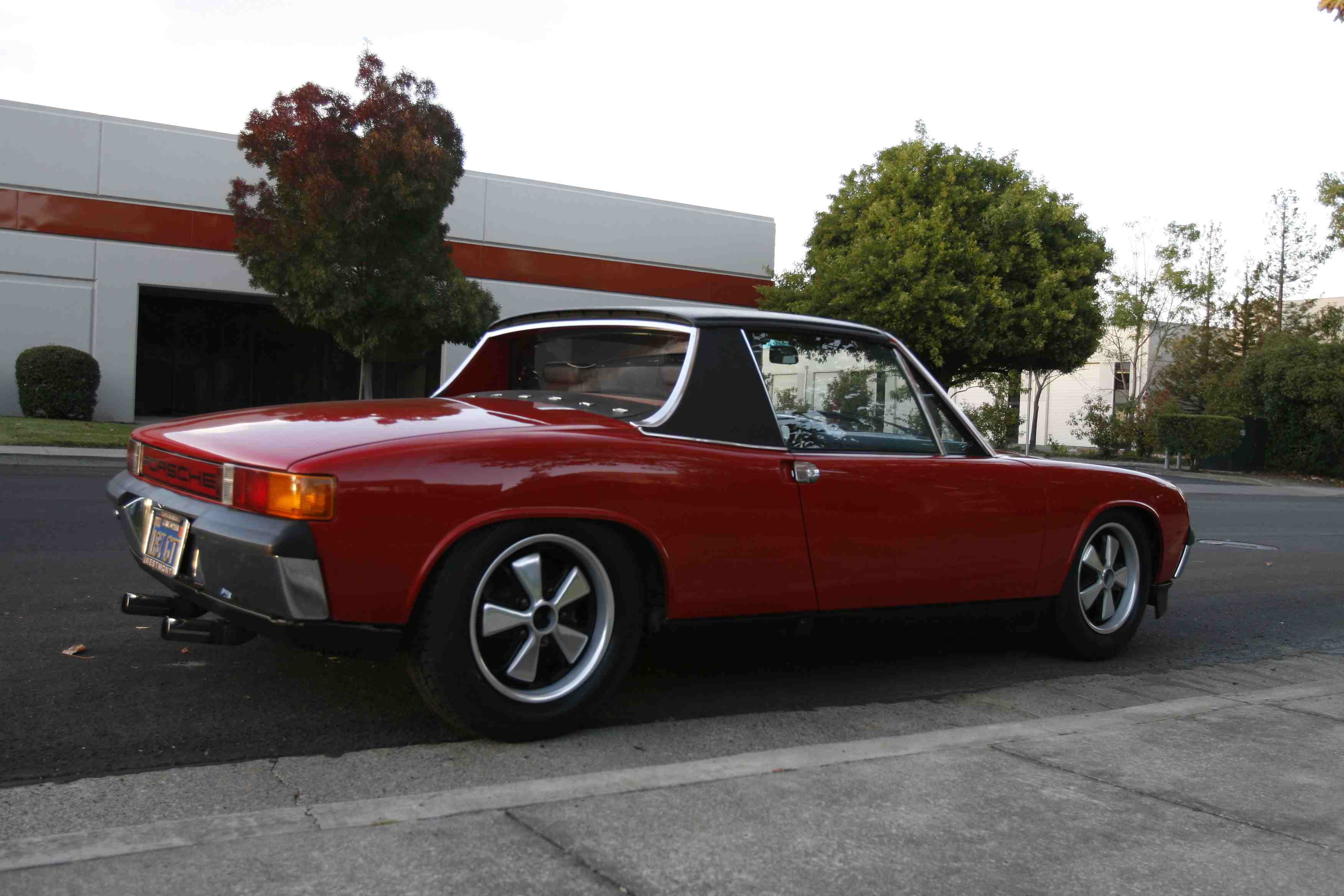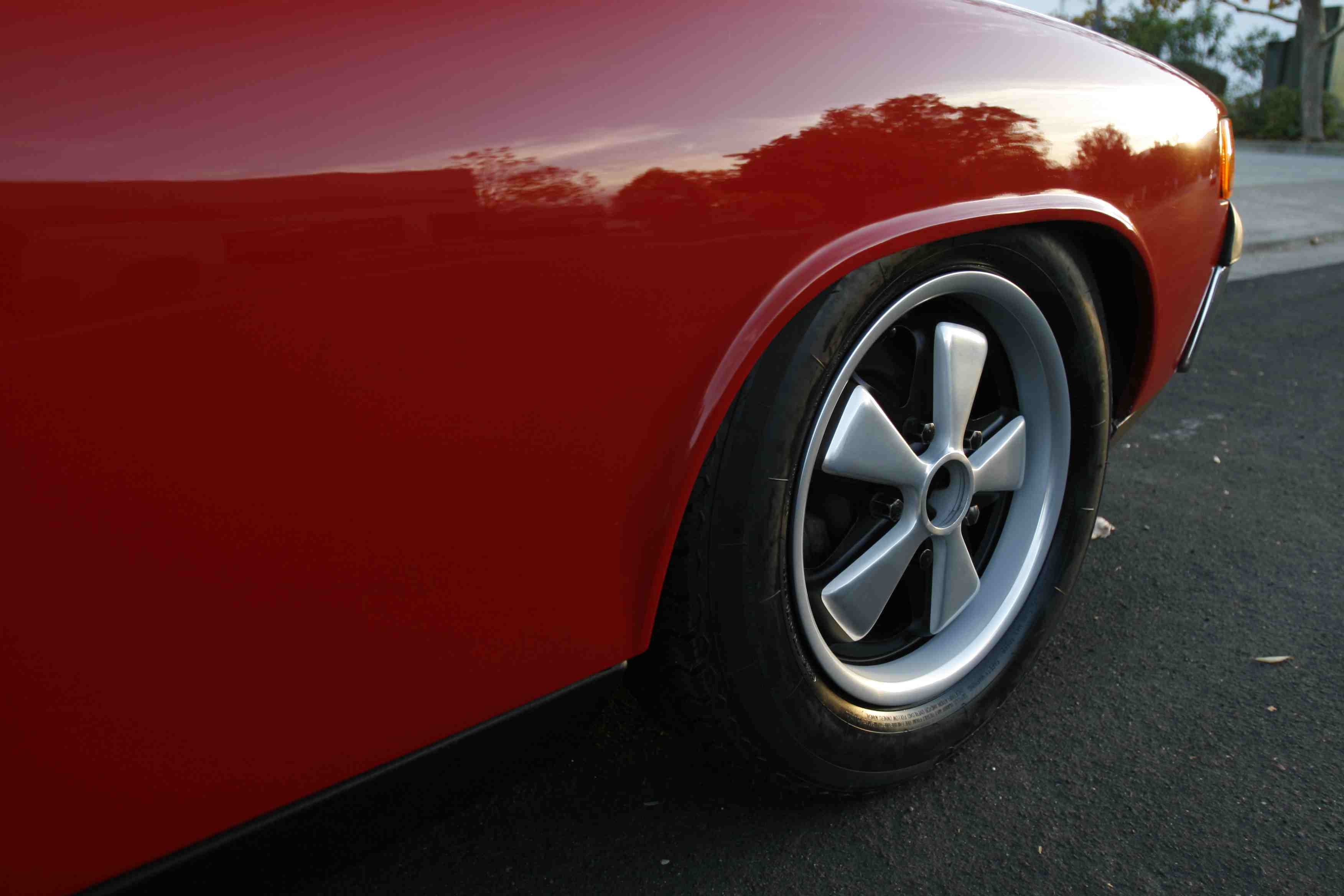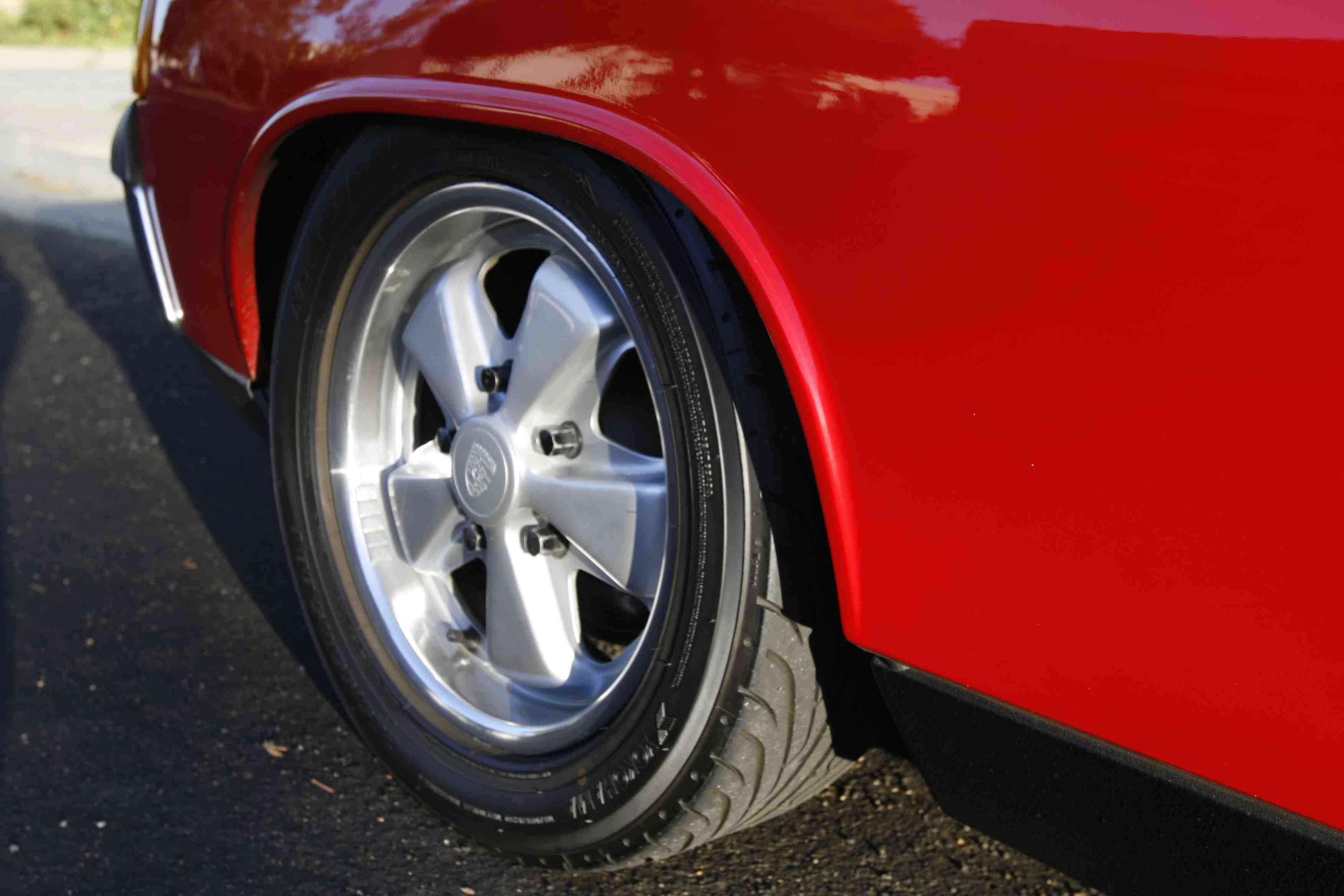 All up, I dig the new look and the fact it is period-correct, but I do miss the "uniqueness" of the old silver wheel with polished lip look. However, I like the fact that the wheels now complement the rest of the 914's bright and black finishes. I also miss some of the aggressive stance contributed by having 205s filling out the fenders. On the other hand, I dig the fact the taller tires fill out the fender cut-outs both vertically AND horizontally, the latter being an aesthetic "problem" with low-profile rubber on 914s. I'd be tempted to move to 195/65s or 205/60s to fill out the fenders, but there are none I like in terms of vintage-looking sidewalls and non-alien tread patterns. I think I am leaning towards thin spacers in back and fairly aggressive spacers up front to fill out the fender wells, a problem that's most noticeable in the photo in the post above. And this is with 911 front suspension. The narrower 914 four-lug setup would be even worse!!! I know there are others who could care less about sidewall and/or tread pattern aesthetics (I used to be among them), but I am starting to view my 914 differently. I don't plan on driving it any slower, but I do like the idea of tires that look like they're from the period and, more importantly, accentuate "feel." Now, if I get a killer motor, the only way to fly might be a set of Yoko R-compounds in 205/60R15. The good news with those is the sidewalls are simple... Hope this is an informative thread for someone trying to visualize differing options when it comes to 914s... Attached thumbnail(s) |