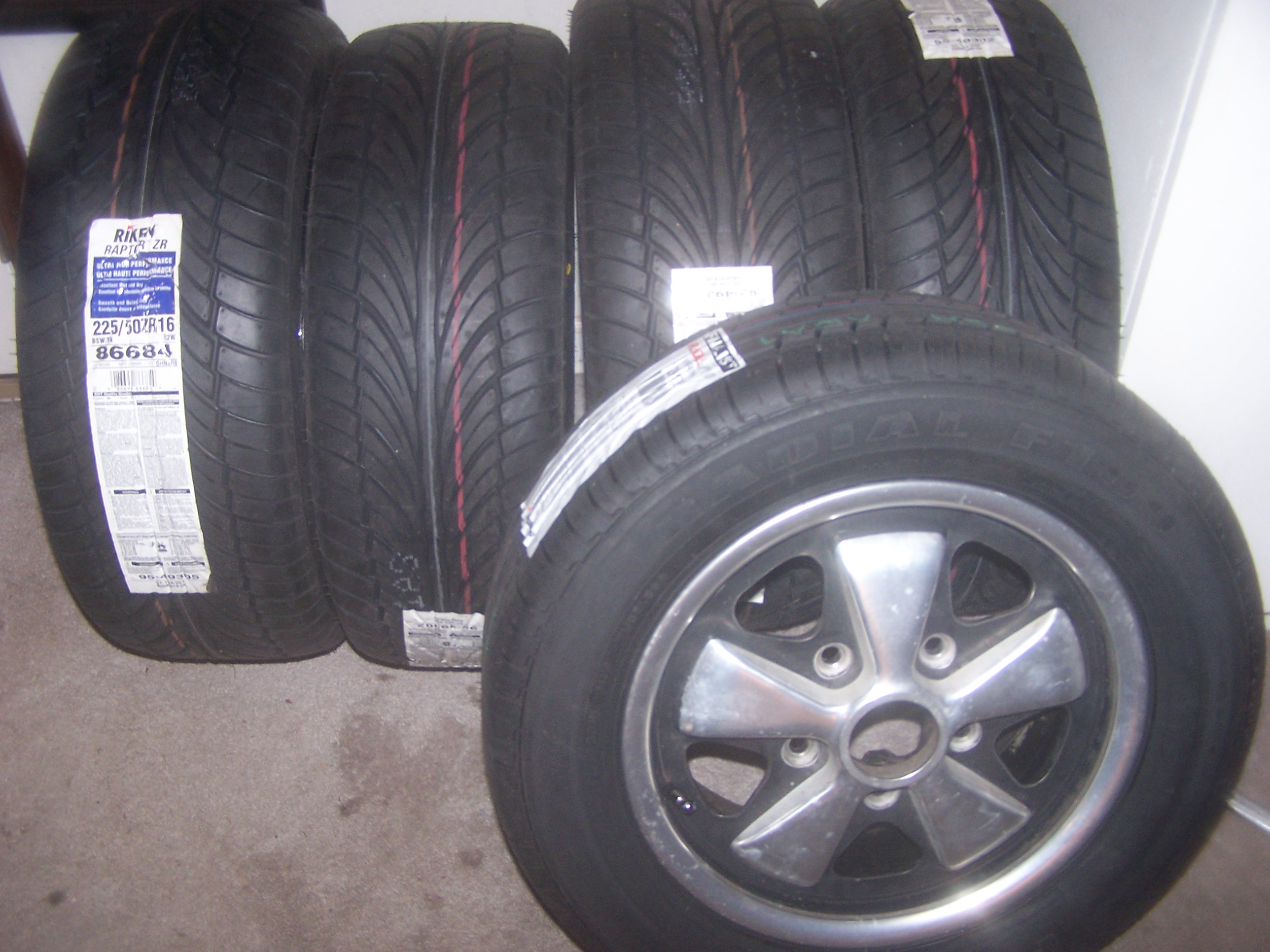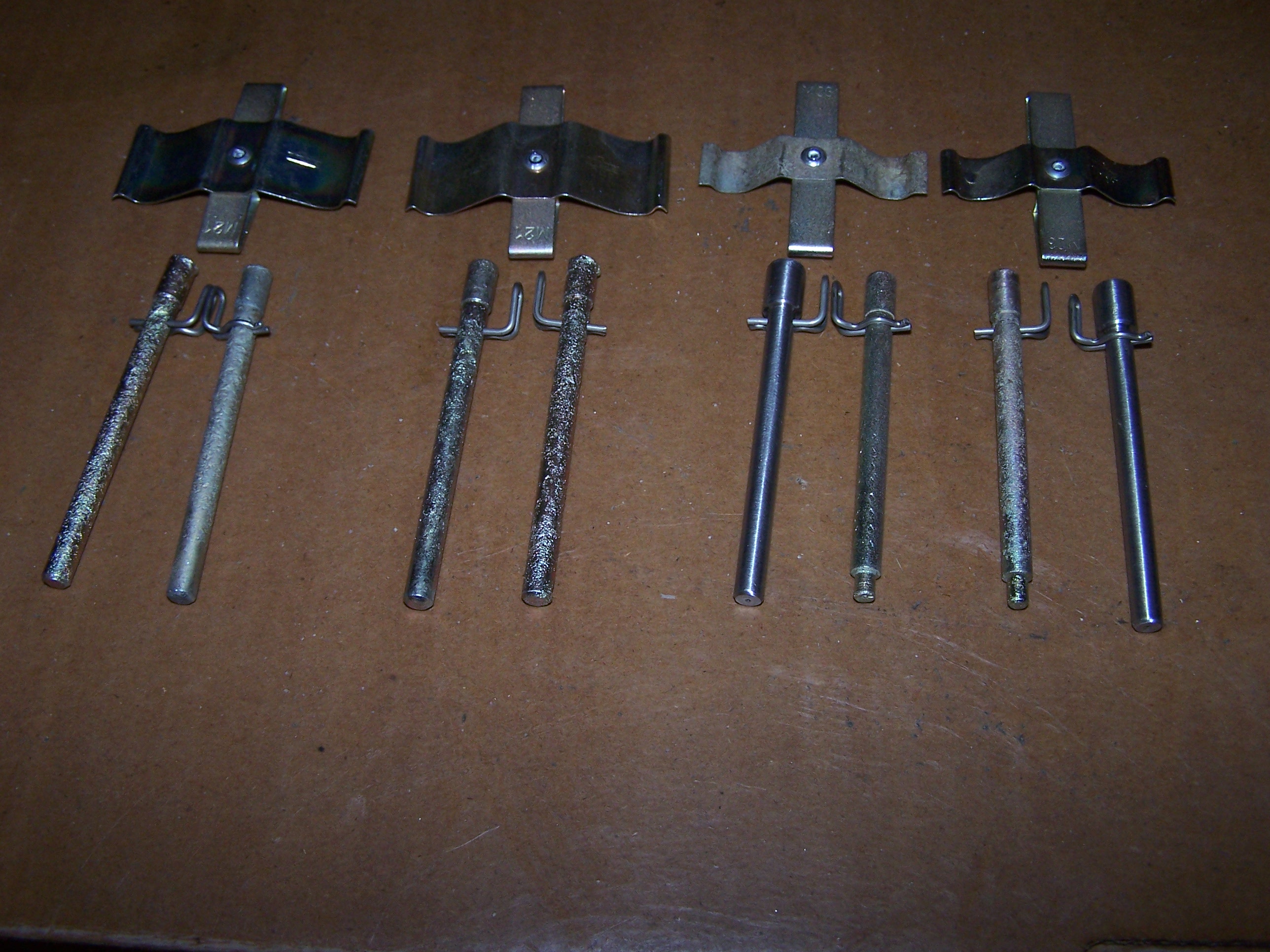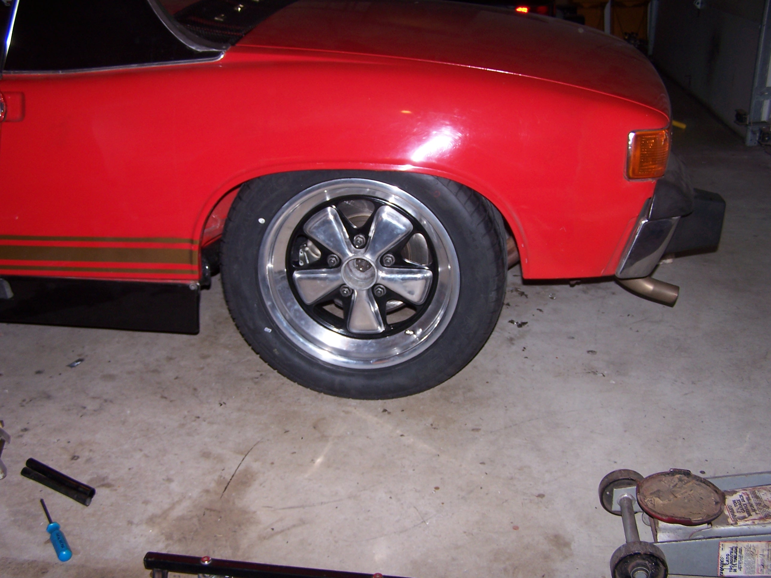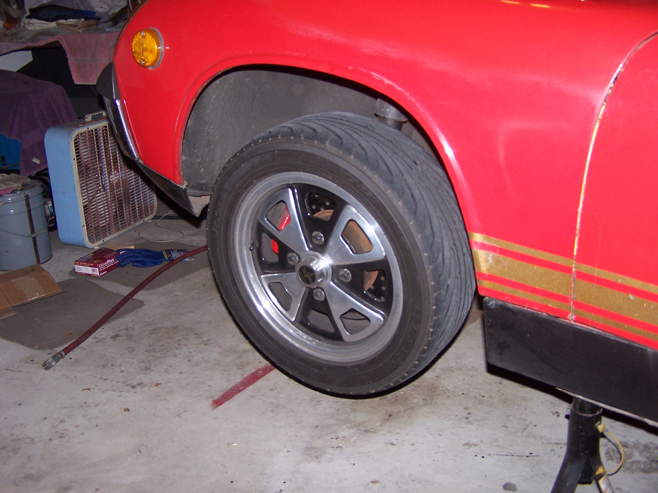 Front end is from a 72 911 with M calipers. Rear end is using the hub from the 72 911 with vented rotors, widened 914 rear calipers and cut (by Eric Shea) rear 911 rotors. I had to replace the stock studs with the vented rotors so I went with 66mm studs which provide more than adequate threads. Tires are Riken Raptors; 205/50/16 on 6x16 for the front; 225/50/16 on 7x16 on the rear; and 195/60/14 on 5.5x14 for the spare. Very nice caliper pad retaining clips from Eric Shea at PMB. |