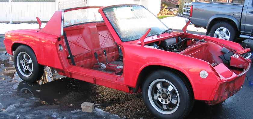 I was bumpin around on ebay looking for a teener when I found one that was in decent shape for $350 but ther reserve had not been met, obviously. When no one ever bid on it I decided to cantact the guy. When I finally got ahold of him I offered $500 for the car and he said which one. Naturally I said the 914 and he said which one. The guy had two for sale, and to make a long story short, he said he would sell be BOTH for $1000, but I need to ship them 400 miles. I ended up buying the better of the two, the other was in really bad shape, for $600!!! When I got the car I looked around... NO RUST, except for a tiny spot by the targa pillar. Solid running engine, which I sold. And a solid tranny, which I still have. There is some evidence of a very minor colission on the front left side, but VERY minor. So here are the pics. The first set is from when I got it in my driveway, and the second set is after 2 days of teardown. Just arrived After a bit of teardown -Chris |