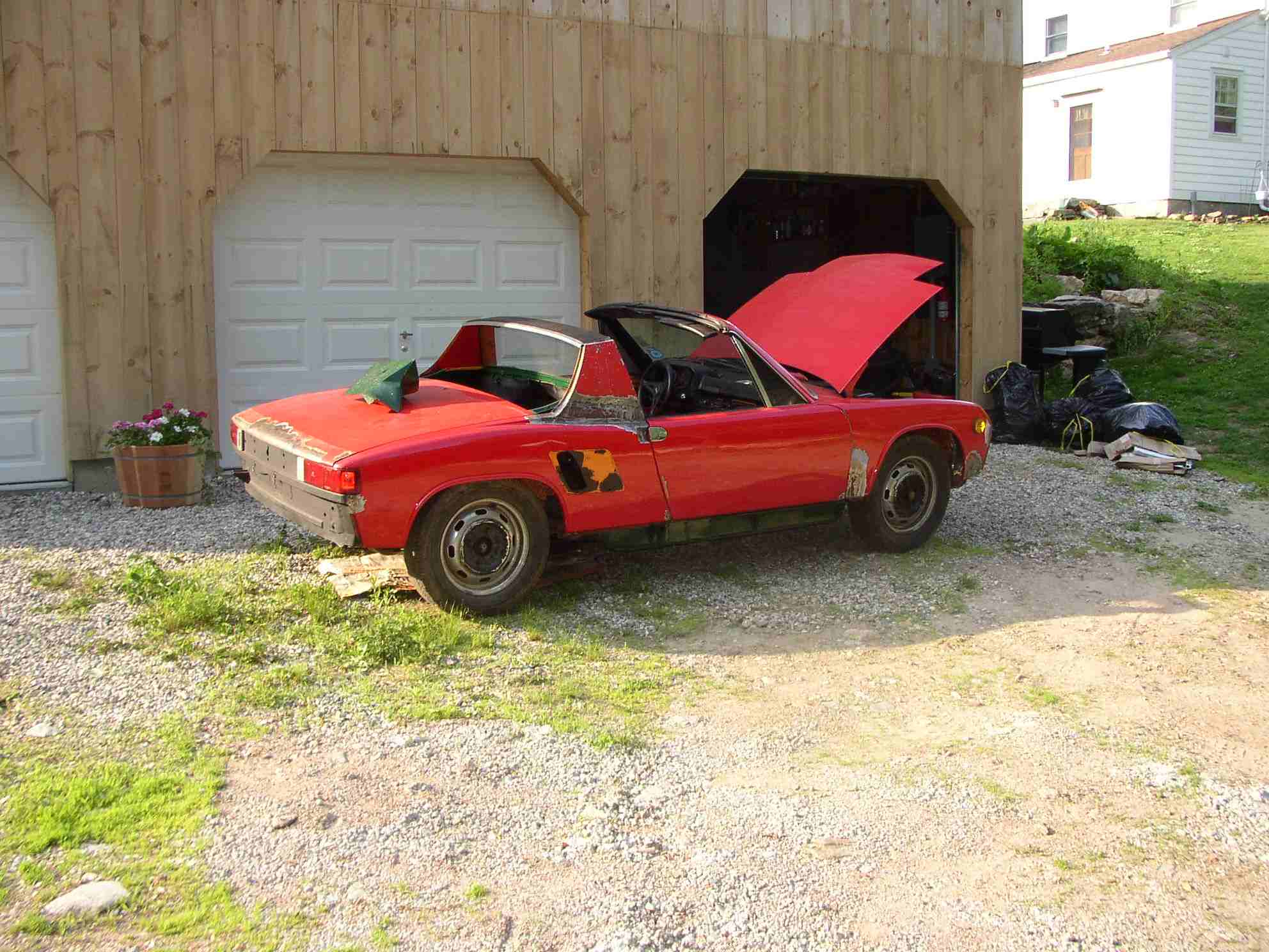 1973 914 1.7 in Bahia Red/black, chassis with 250,000+ miles and a question-liter that's been in the car without removal since at least 1986, when my older brother bought it. I've had it since 1990 or so. Believe engine to be a 1911, but know one knows -- hence the "question liter" tag. Not fast, but has been essentially bulletproof for 20 years. ALWAYS starts, and always gets dusted by minivans at stop lights. 2.0 SSIs and 2.0 Abarth muffler (only ever seen one more). Five-lug conversion in 1992 with 15x6-inch Fuchs "deep sixes" and 911 "M" front suspension and brakes. 140-lb rear springs on Konis, 22-mm Weltmeister front anti-roll bar and 19-mm m/c. Only painted once, in 1991, in VW/Audi Toronado Red. Side-marker delete and Euro lenses, LE spoiler, and Saratoga top. Inside, just a Momo Prototipo, Weltmeister SSK, and heated GTS Le Mans seats (on the way). Likely to get a six someday, a full suspension re-do (also, someday), and the NARP reflector (thanks, PO! (IMG:style_emoticons/default/dry.gif) ) removed. I think that's about it. Attached image(s)