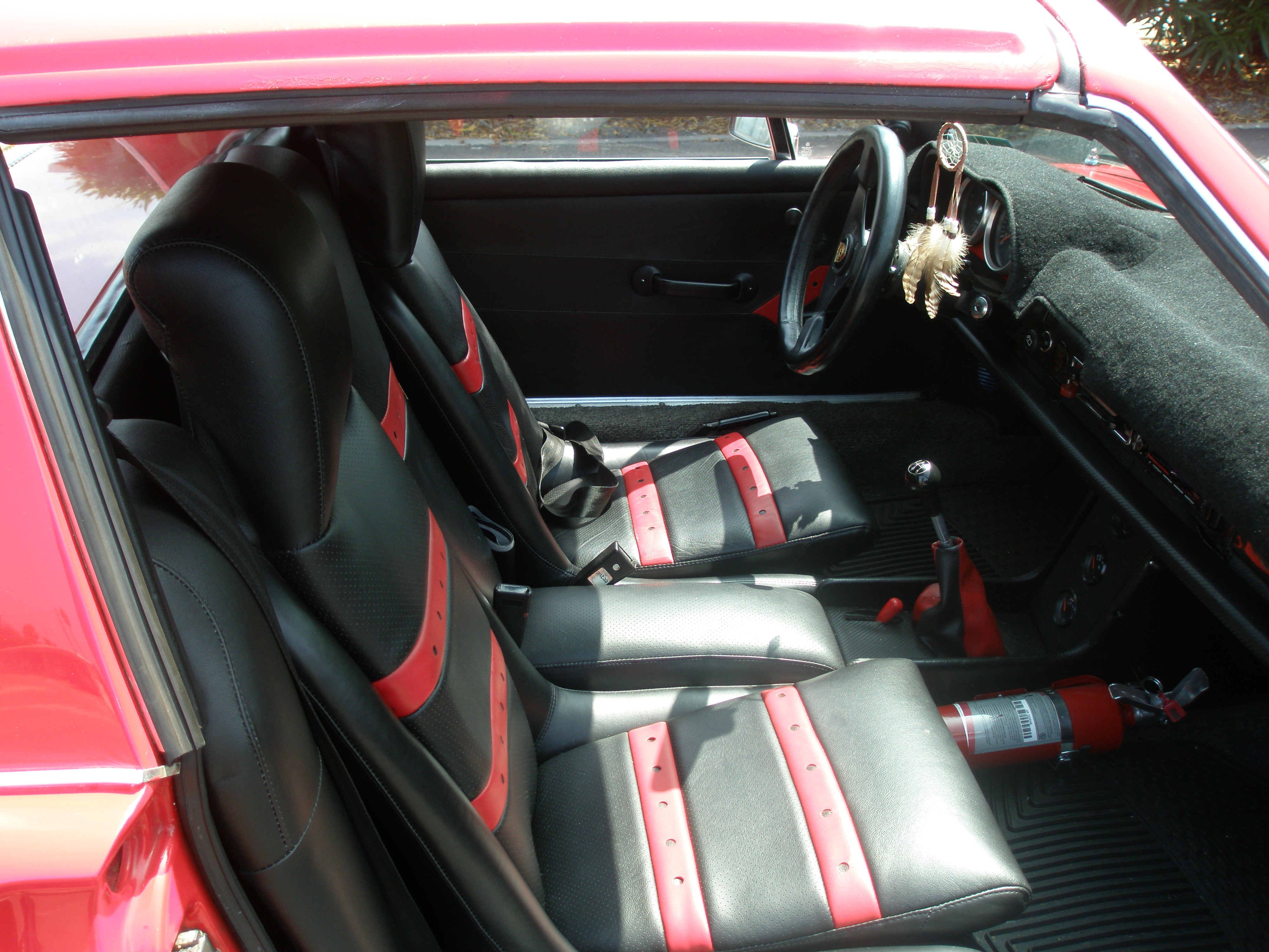 The seat belts mechanisms are stock: I re-webbed them with red webbing. Think I bought the webbing from Seatbelt Pros.com...