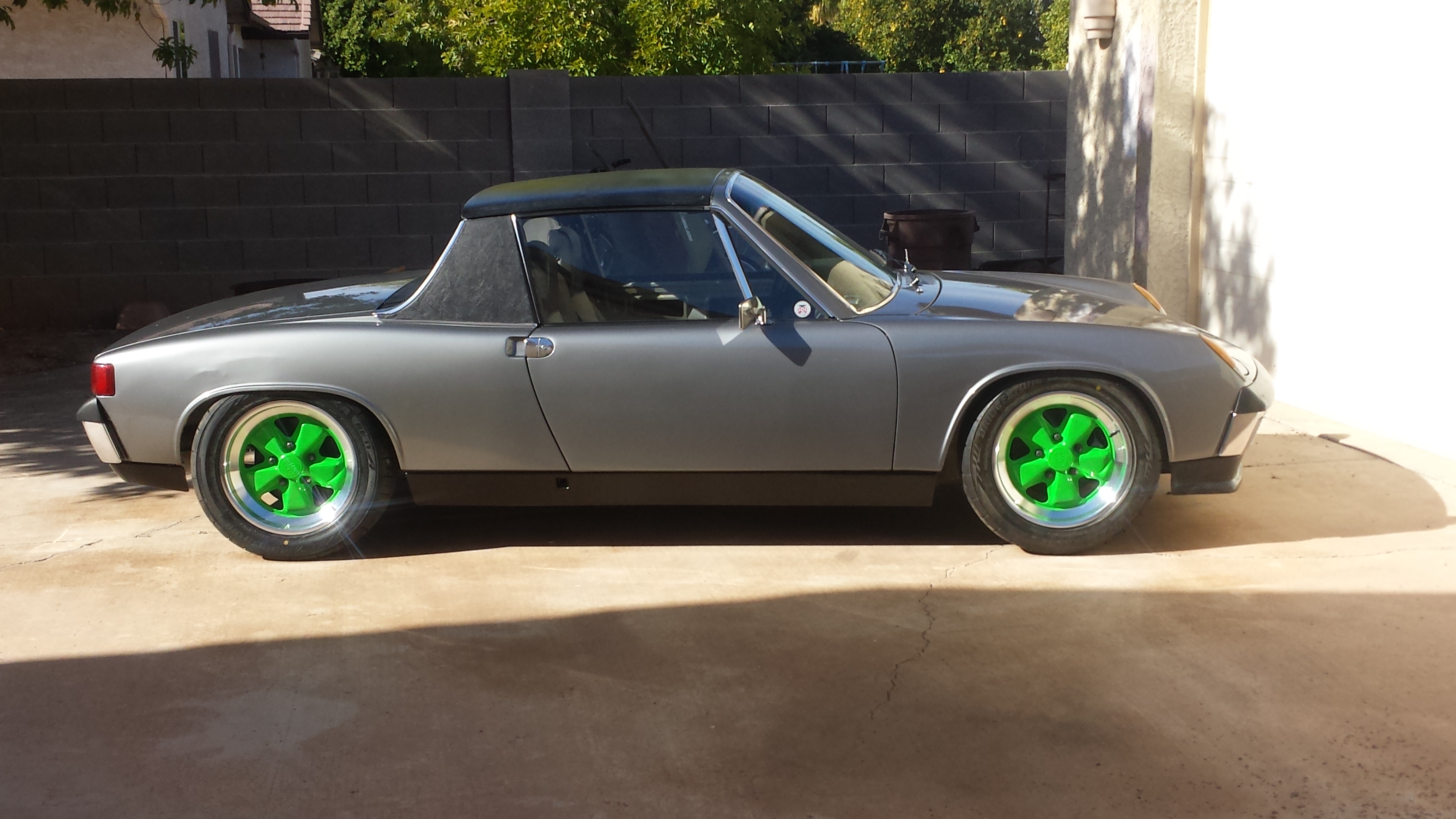 First time off the jackstands in 5 years. Not so sure about my choice in wheel color, I have a matching positive side stripe, but I'll need to get the rear fenders fixed and painted first. I like the green especially if you have some complimentary color stripes going on! What Fuchs are those? 16x7's all around? Do you know the width and offsets? They fill out perfectly. They are 16x7 911 offset all around (23.3 offset), 205x55x16 tires. The rears wont fit without doing some messing around with the fenders. |