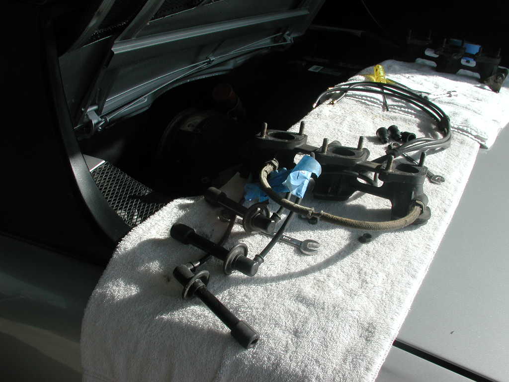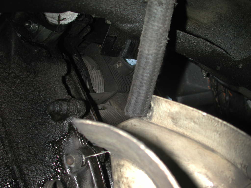 Now we unbolt all shroud bolts. Most are visible. There are a coupel that are not. Front edge of the shroud has bolts (most interesting one is behind the dizzy) and there are two that are accessed from under the car on the drivers side, just up from the rear wheel.