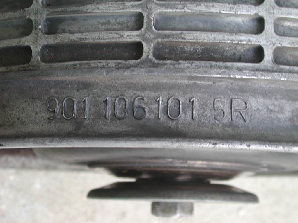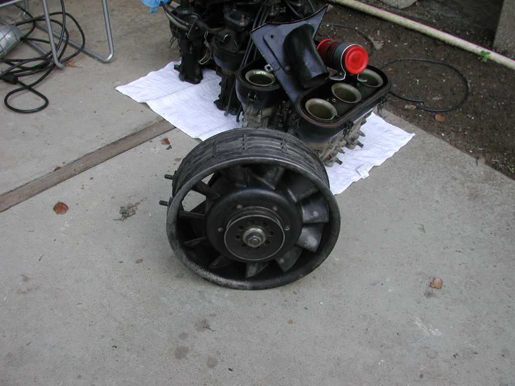 Now it gets interesting. Most obvious things have been unbolted/etc -- the cable in the center of the shroud is the culprit -- it winds through the air diverter gadget bolted to the back of the fan/alternator, underneath the shroud, and ends up bolted to the back of the alternator itself.