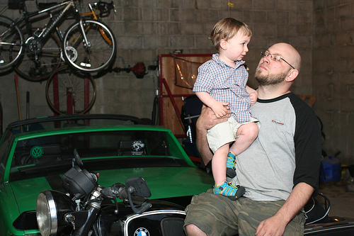 Evil also spent some time trying to convince my son to ride motorcycles (while Theo tried to convince Mike of the benefits of wearing poopy diapers!)