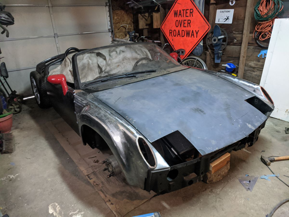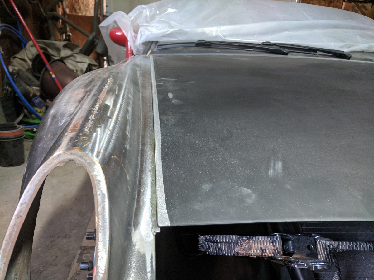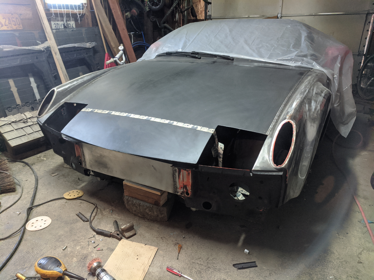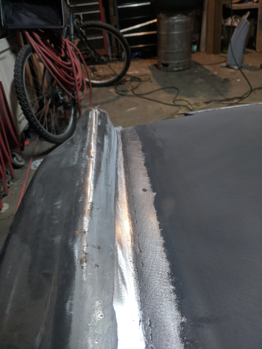 I am going to re-cut the front opening once I get the bumper figured out but I really think the hole can be much smaller than it was before. We were just copying the design for the V8 cars at the time but I think that is way oversized now that I have lived with the car for a while. Then I finished the welds, should be able to finish this seam with a light skim coat of filler. (found another dent in the hood too (IMG:style_emoticons/default/biggrin.gif) ) Next I am going to rebuild the structure that attaches the front hood structure to the nose of the car and make some headlight filler pieces. |