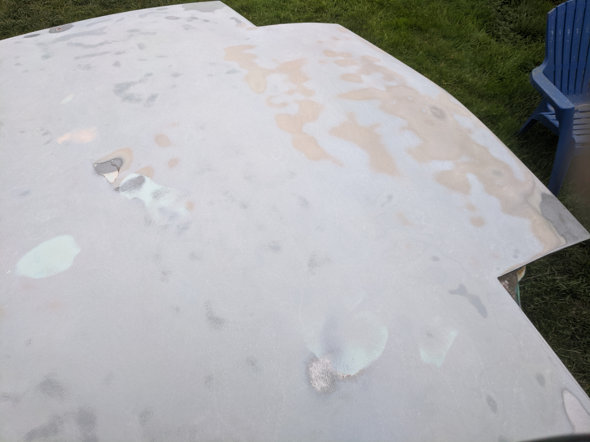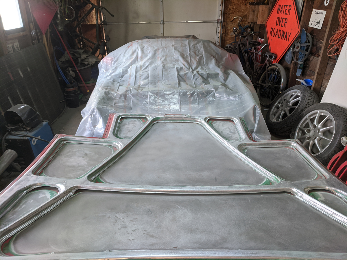 Merry Christmas, your present is Bondo! A lot of it! After stripping away pounds of Bondo it looks like this lid is actually pretty clean, it just suffered from the two most common injuries that happen to these lids. The dent where you put your hand to close it, someone closed the lid on a strangely shaped, too big object, oh and there are a few rock dings. I can totally work with this, an afternoon with a hammer and dolly will get this straight, I think the last person just added Bondo until the high points were hidden, yikes! |
