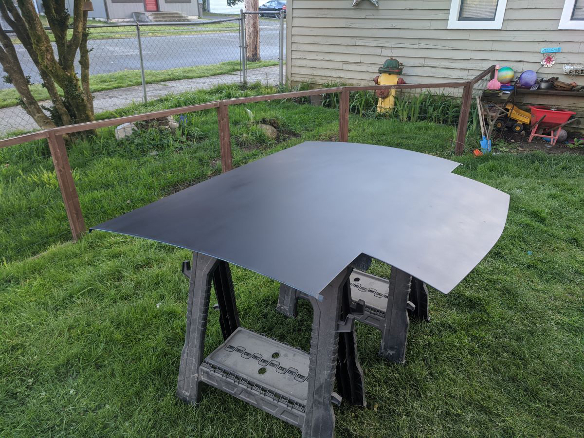 Ground the weld down 75% of the way or so, filler strips are also still wide. You can see I also masked the edges of the hood when I primered it so I have a clean edge to weld to, forethought? What's that? I mounted the fenders, laid the lid on them, now I will mark and cut the hood opening, then weld it in. |