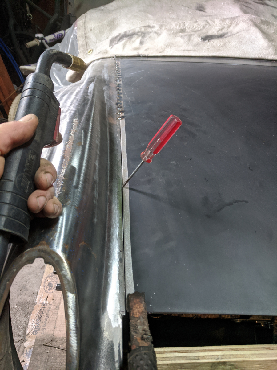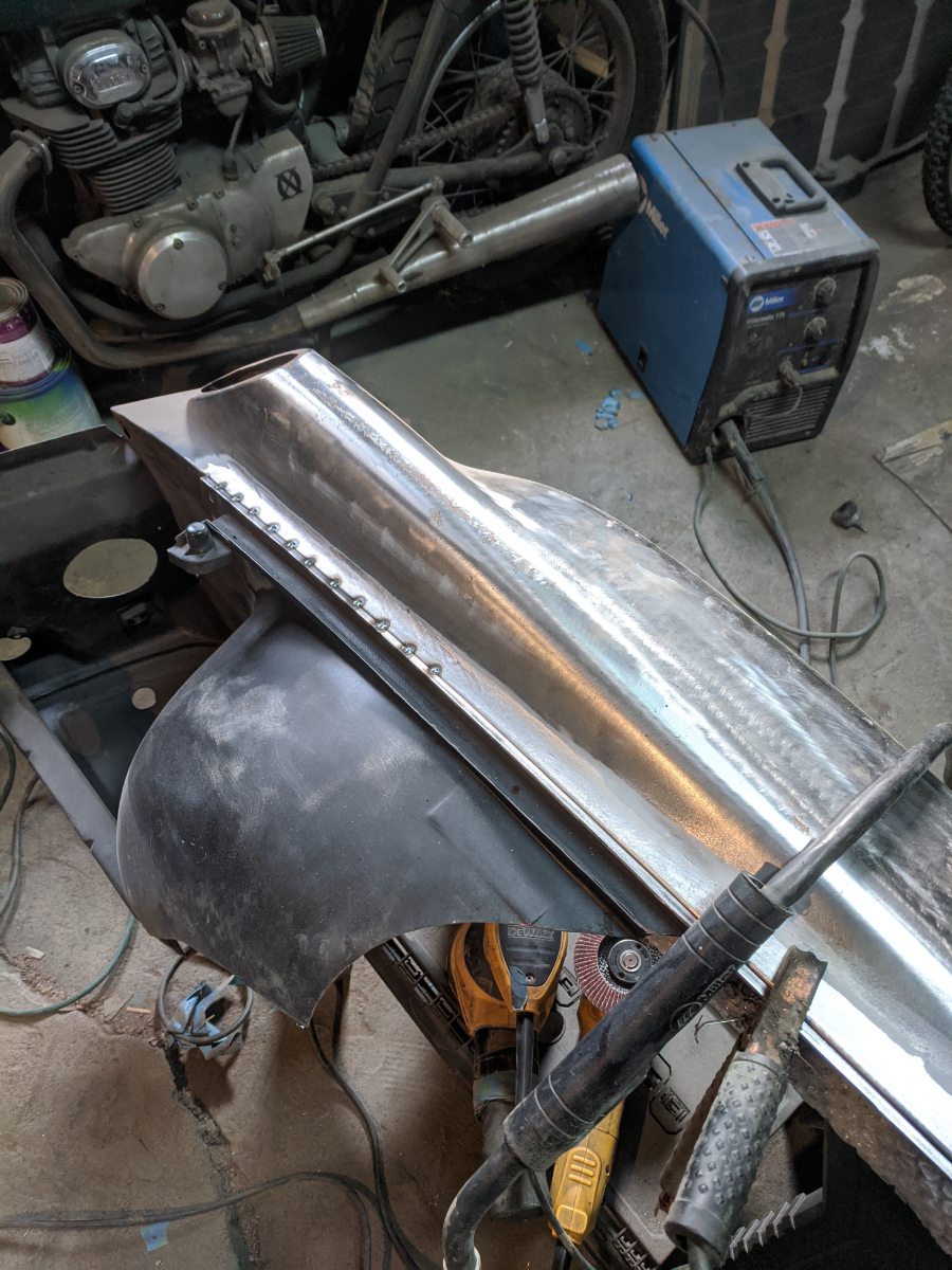 Between the fold in the fender and the 1/8" material I could sink some good heat into the tacks, but went slow and tacked every inch or so, then every 1/2" then slowly filled in the gaps. 3 feet of weld down, 9 more to go! |