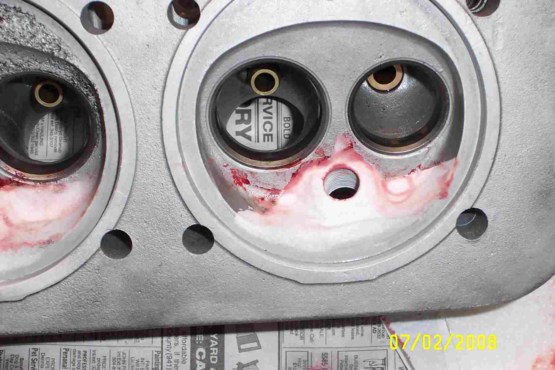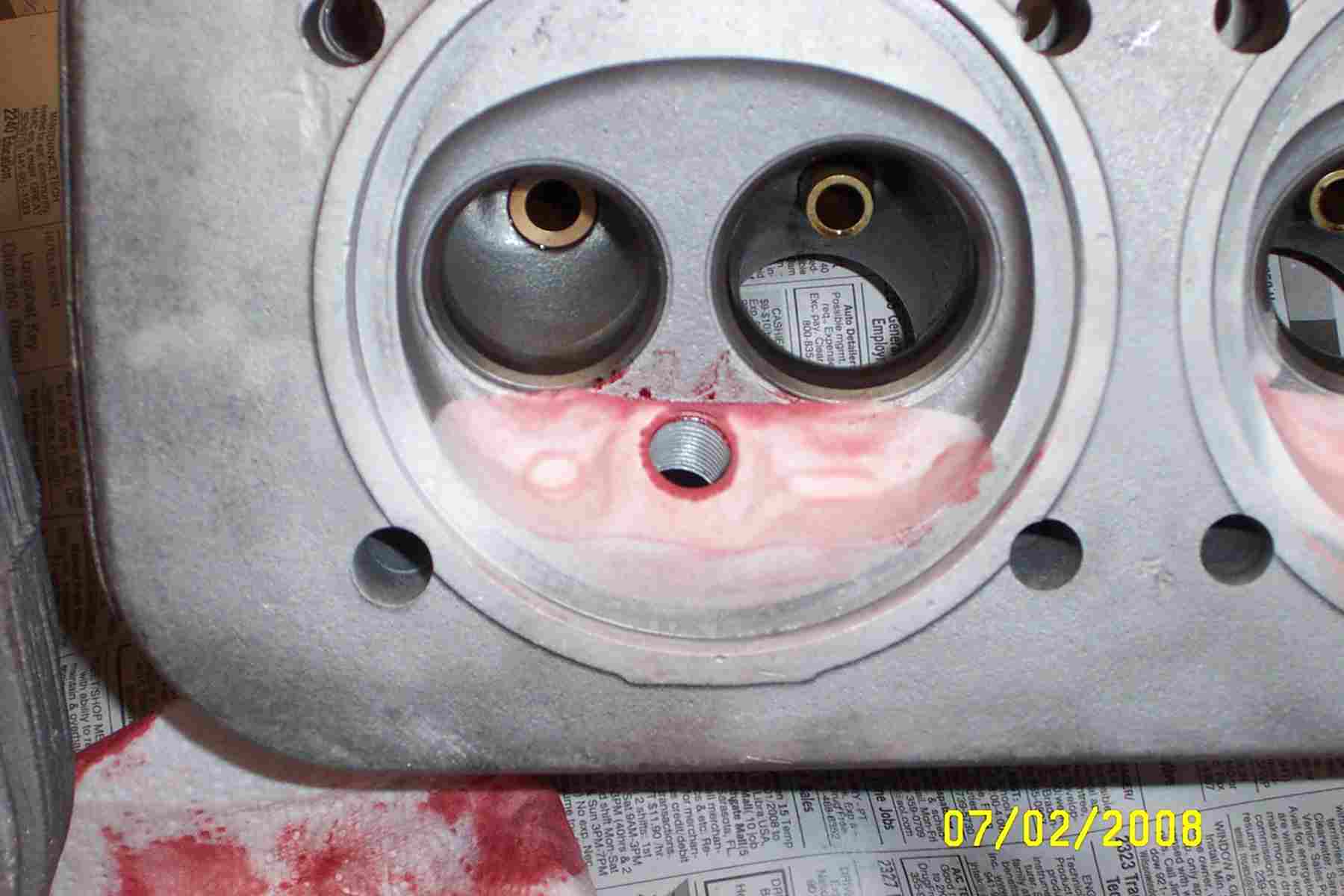 Ugh, it's down in the plug threads. That will have to be fixed. Ken Thanks for the reply. I can fix the plug threads as I have an insert kit. That should fix that part. I am concerned that the pitted surface may cause bad combustion, hot spots, etc. But on the otherhand, it might be fine the way it is, as we just want a stock motor. |