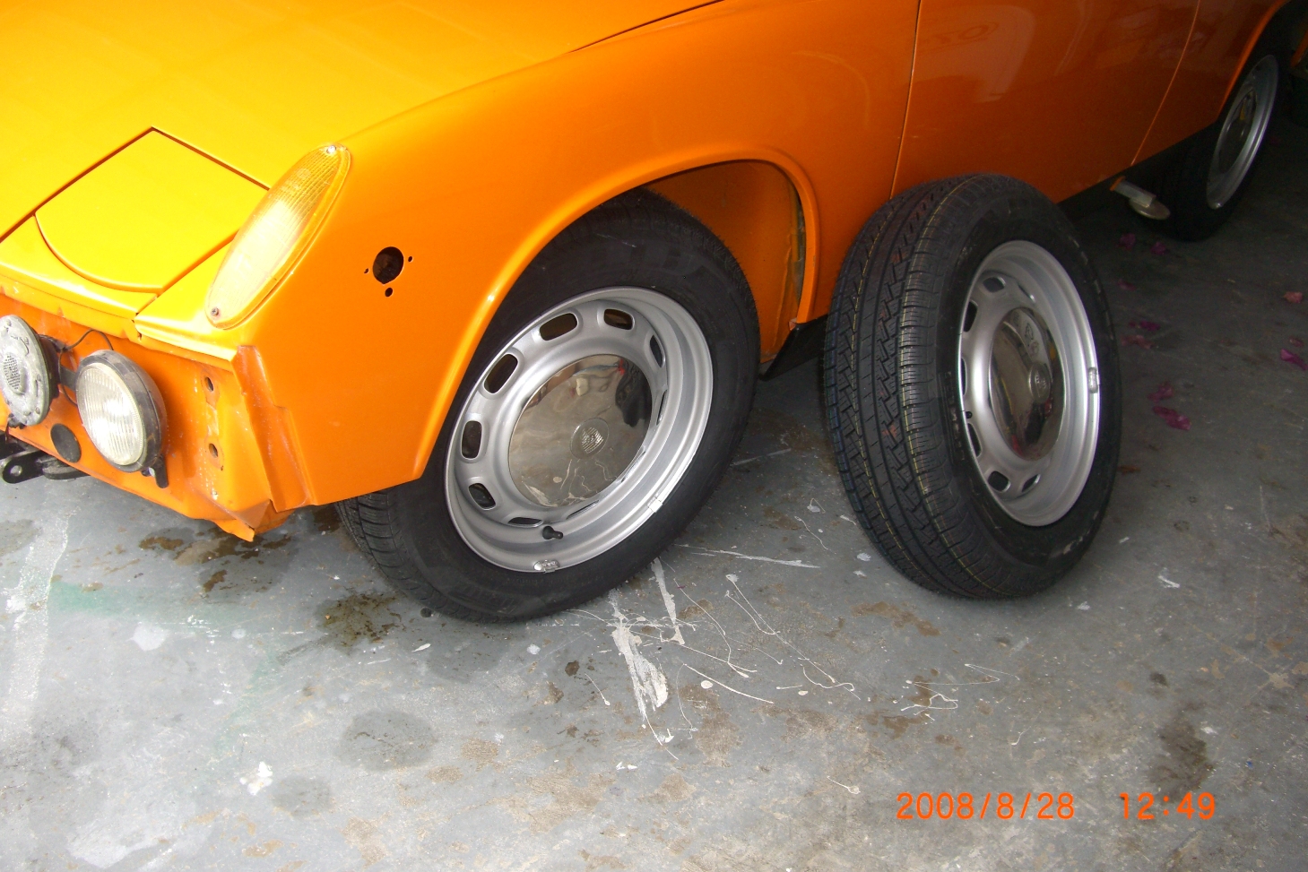 Pirelli P6s, 185/60/15 tires mounted and on the car. Matching spare with hubcap. It's coming along, children.