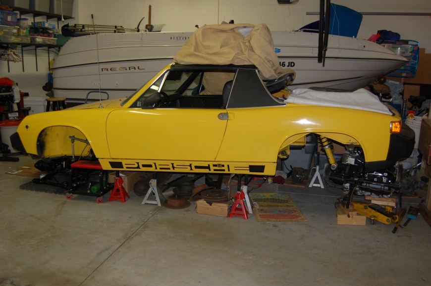 My Porsche fascination began back in the early 70's racing 917 Can Am slot cars in the basement of my house when I was 7 or 8 yrs old...When I was Freshman in college (1982-83)I began a searching for a 912. I couldn't find one in my price range. I met a woman taking some college courses and after studying on campus one evening I walked her out to her car. When when she stopped at a yellow 914 with For Sale sign in the back window I said "is this yours?" She replied..."no it belongs to my husband...he bought it new in 1975 at the dealer in Sarasota, FL. and he just ordered a new 911SC so this is up for sale". I asked her for the price and she told me she would have to let me know the next day. Within three days I purchased the car for $4750.00 with a loan from my dad. I drove it for a the balance of my college years at the University of Florida. Much fun...many autocrosses and few DE's with PCA. The car sat on jackstands in my aunts garage from 1988 until 2001. It had battery tray rot and needed an inner wheelhouse, rear floor pan etc. I began working on its restoration. About two years ago I decided to convert it to a six after picking up a motor and many conversion pieces from a guy who had planned to convert his 75 914 to a six...Within about a month I found out that another local guy here in Orlando by the name of Rick purchased the 75 roller from Jim.. the guy I bought the conversion bits from. After meeting him through PM on this site he told me he planned to convert the roller to a six as well ! The world of 914's is crazy...Here are a few pics of the car. I will begin posting more as the project progresses. Today I rough installed the RJ bulkhead mount. |