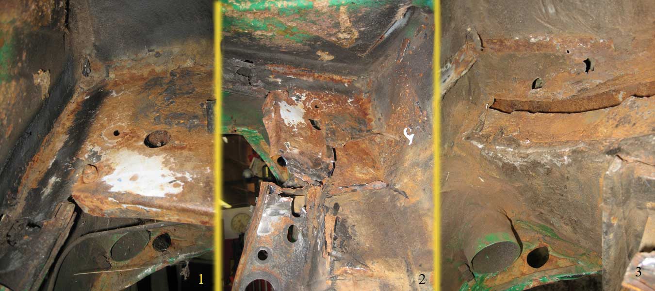 These pieces (to me at least) look pretty dismal. I'm hoping against hope that after a thorough sand blasting the engine mount can be reinforced and salvaged. The suspension console, on the other hand, has rusted through in many of the awkwardly shaped sections such that I'm thinking replacement is in order (IMG:style_emoticons/default/dry.gif). After a bit of research I've decided to forgo POR15 in favor of a different product called "Rust Bullet" (IMG:style_emoticons/default/stirthepot.gif) . I've ordered a quart (supposed to cover 25 sq. ft) and will use it to protect the inside of the passenger long. I cant wait to start patching this thing back together! ...some pics of the Hell hole now missing much of its metal... |