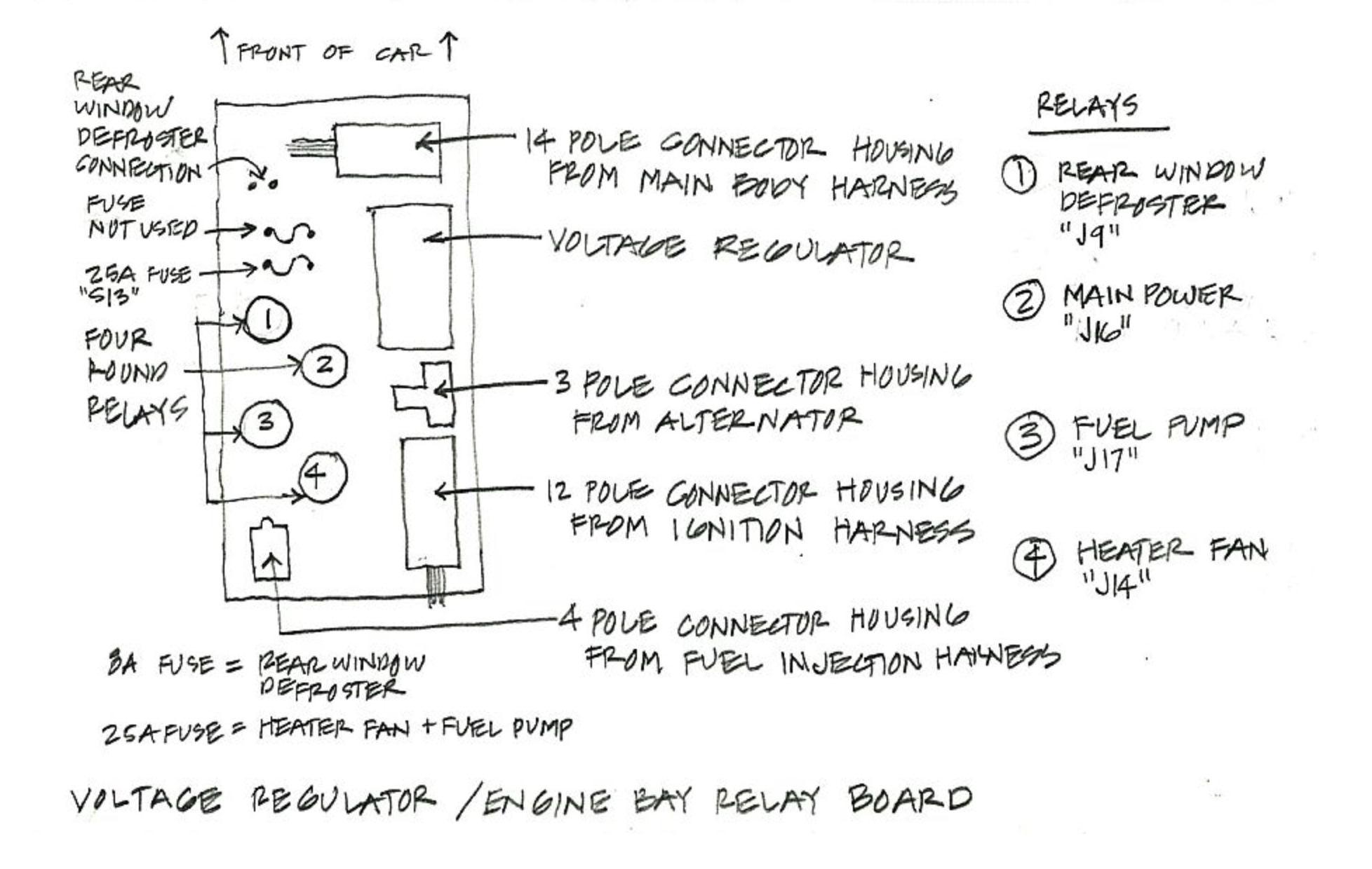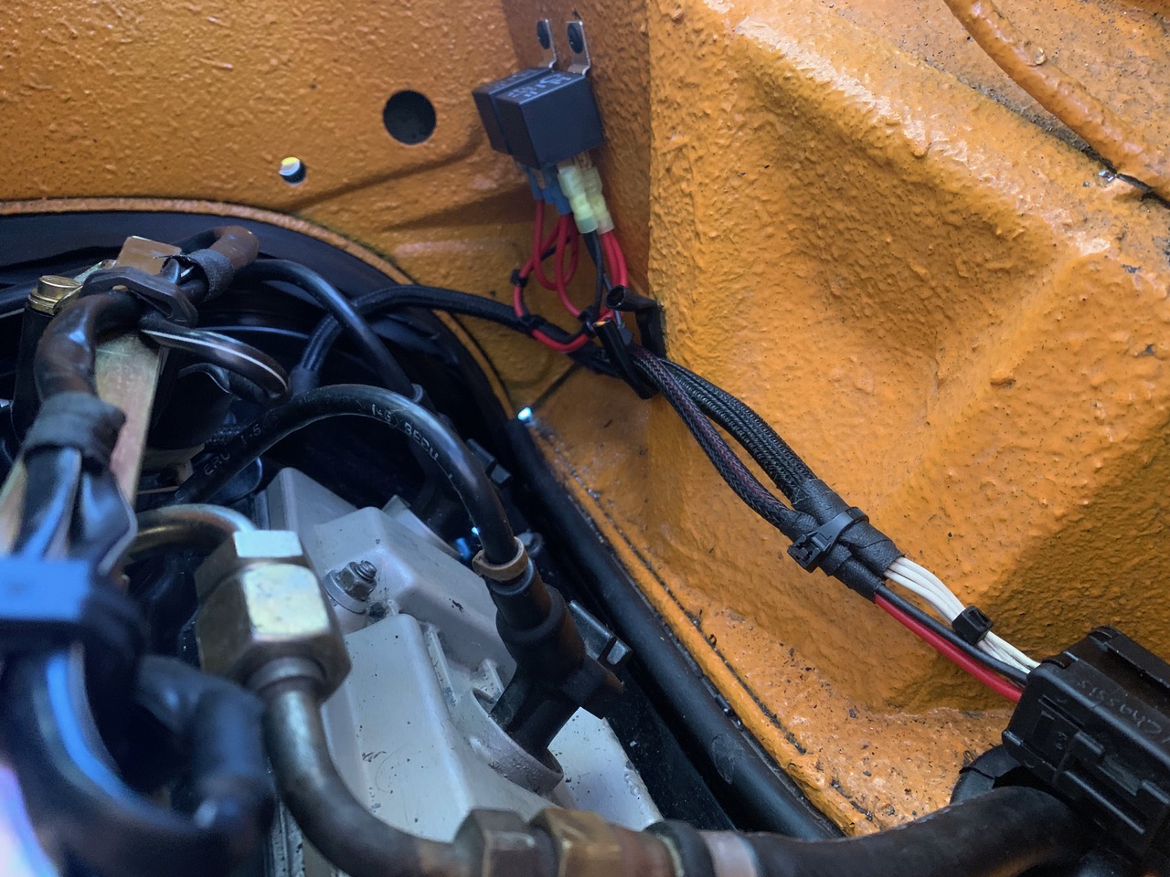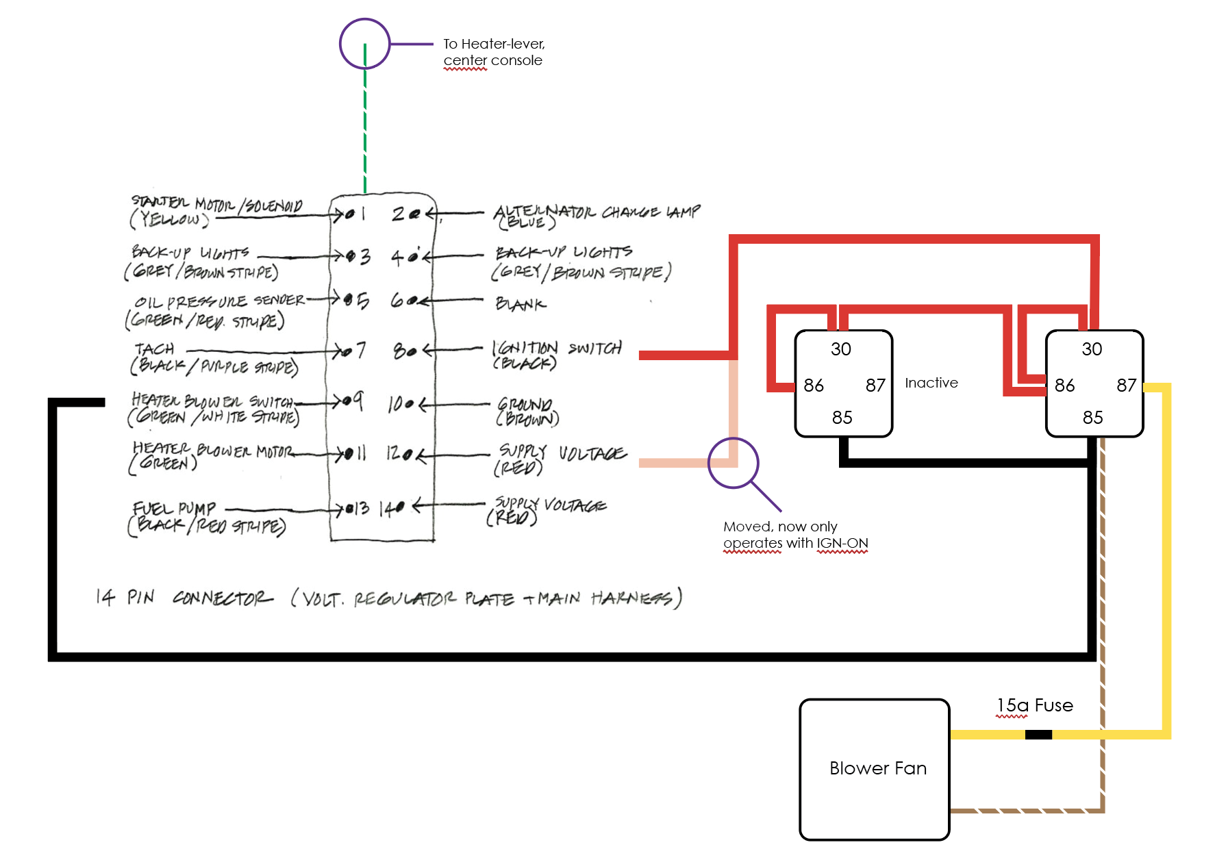 Reading through the wiring diagrams, the Bowlsby-site is invaluable for something like this (Link to the Bowlsby site here)) and even more so, as my original relay-board has been deleted, forcing me to come up with my own-scheme that includes a relay and fuse solution. If you reference the first-photo showing the 14-pin connector that plugs into the relay board, you'll notice that there are two-leads, #9 and #11, associated with the heater switch (the lever in the cabin) and the blower that is in the engine bay, the second image shows the 'stock setup' that lists both fuse and relay. The solution I used was to install a 14-pin connector, and make the 'Ground' for the relay correspond to the heater-switch, as when its 'ON' it grounds Pin 85 on the relay, turning the system on. Also, I moved the 'hot lead' to correspond to the ignition, it didn't make sense to me that the fan would be running with the engine-off. Additionally, as I'de like to later install another fan on the passenger-side, both providing more air-flow and making the engine bay look cleaner (no heater-hoses running up and over the engine), I left another relay for another fan in the future. If I end-up not going this direction, I like knowing that I have another relay there that I can turn on either with a signal from one of the existing leads, or 'piggy-back' on the leads originally meant for the tach, fuel-pump, etc. One more thing, I also added in in-line fuse to the fan. Though I'm thinking that if I add more equipment later, I'll add a fuse block or wiring box, like in the front trunk. Maybe I'm overthinking it, thats enough for now. Happy Sunday everyone, back to work for me! (IMG:style_emoticons/default/bye1.gif) |
