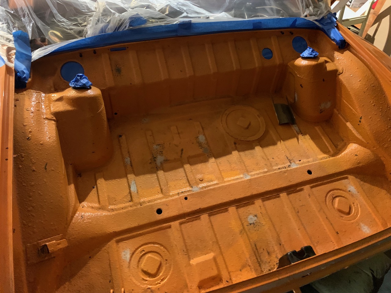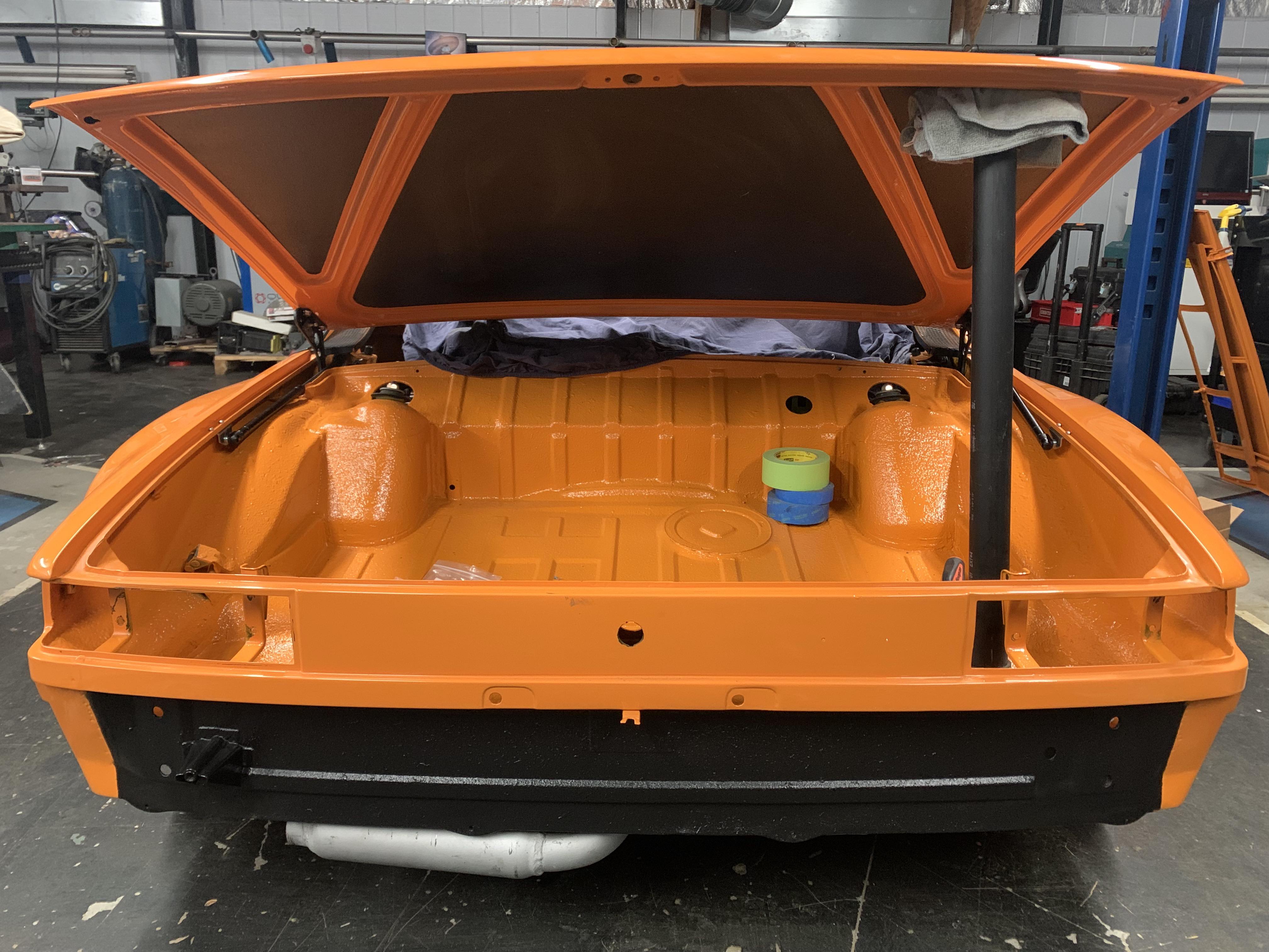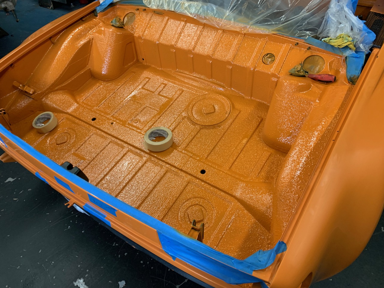 I knew I was going to be traveling recently, so I used this opportunity to have the painter touch-up a few areas on the car and re-spray the trunk since it had a bunch of holes from the original mounting of the ECU. Main concern was a small rust-bubble on the passenger side 'sail', and a spot behind the original paint-code tag. Glad this was the least of my problems, and that we sand-blasted the car before paint. I'm fortunate that we arranged for the painter to come to my house to do much of the 'prep', and then towed the car out to my Fathers ranch to get painted while I was away in Vegas.
