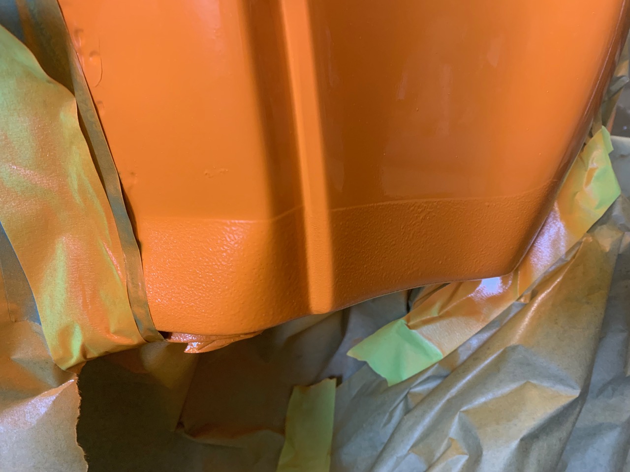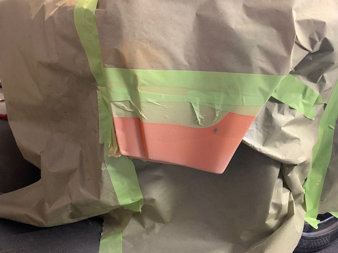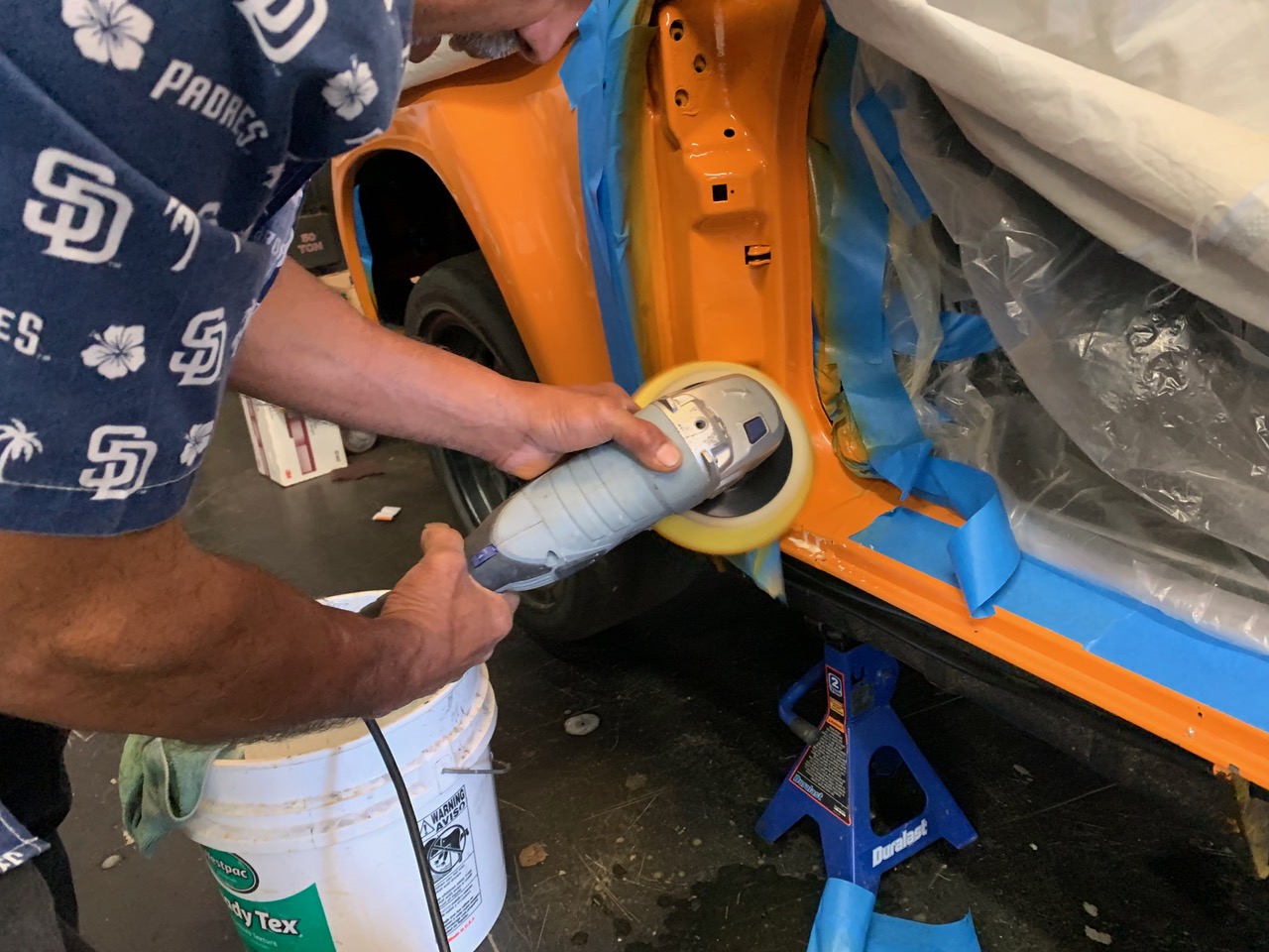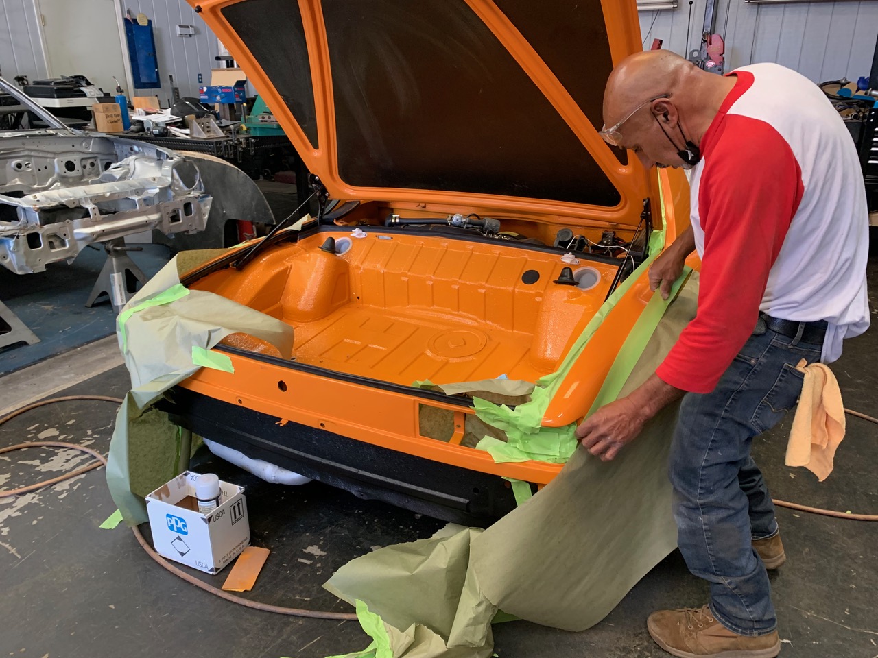 I knew I was going to be traveling recently, so I used this opportunity to have the painter touch-up a few areas on the car and re-spray the trunk since it had a bunch of holes from the original mounting of the ECU. Main concern was a small rust-bubble on the passenger side 'sail', and a spot behind the original paint-code tag. Glad this was the least of my problems, and that we sand-blasted the car before paint. I'm fortunate that we arranged for the painter to come to my house to do much of the 'prep', and then towed the car out to my Fathers ranch to get painted while I was away in Vegas.