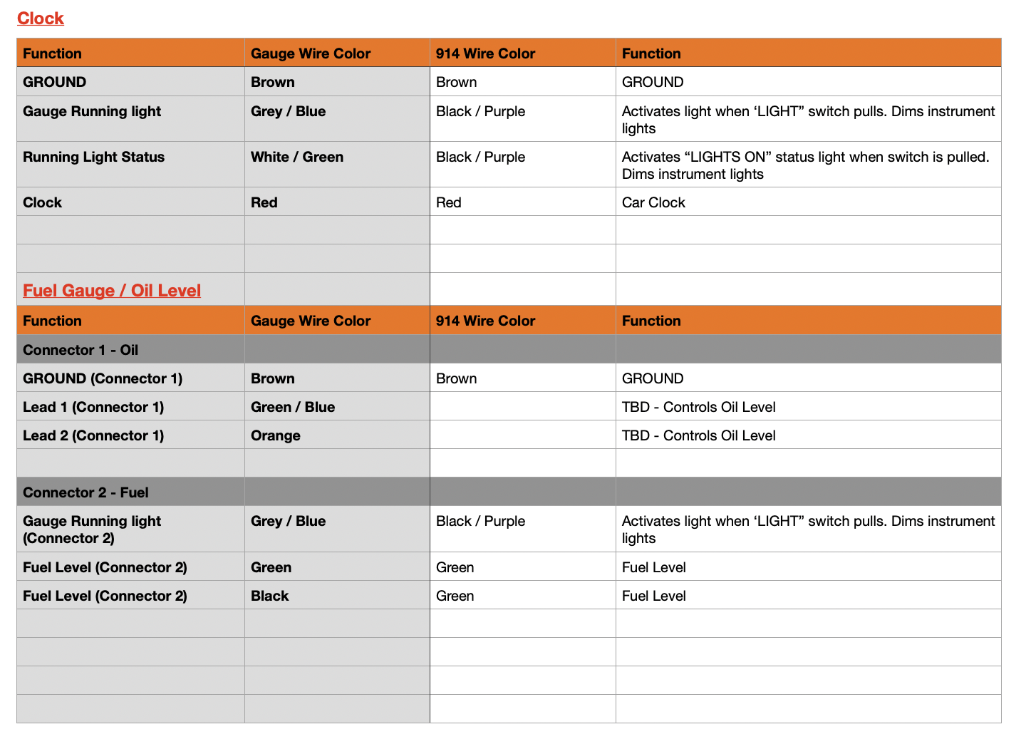 Pretty easy right now, Fuel gauge, Oil Level and Clock with status lights crossed off, and working my way through. Hopefully, tomorrow or this weekend, I'll be able to lengthen the wires with the correct color and make this look more clean. I'll update for anyone with a similar project, spreadsheet below. |