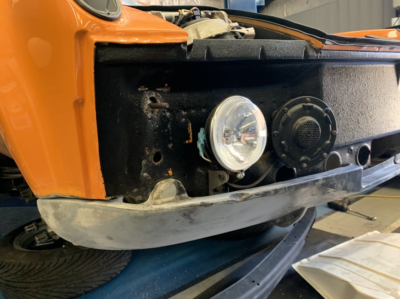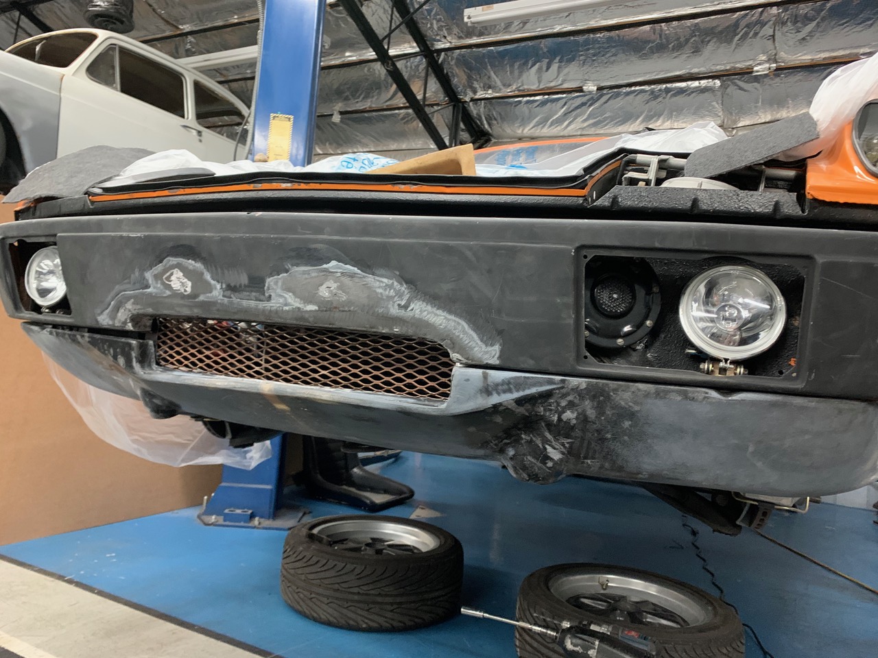 Bodywork on the car is in full swing! I can’t seem to remember where I purchased the front valence, but it did need a bit of work. Split down the middle, widening, and adjustments on the sides right below the wheel-wells / flares. Happy to say though, it’s coming along nicely.