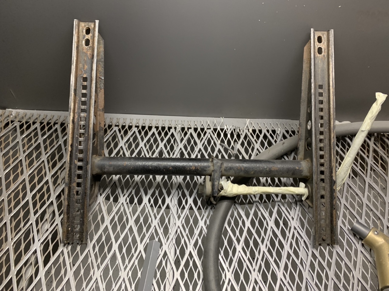 As Joe continued work on the valences and side-skirts, I’m trying to take this opportunity to ‘clean up’ and ‘restore’ as many pieces of the car as I can. First up, trunk hardware, seat rails and brackets. Sandblast, clean, tape-off, paint and repeat. It’s my opinion that the little things like this are what makes a project of this size really shine. |