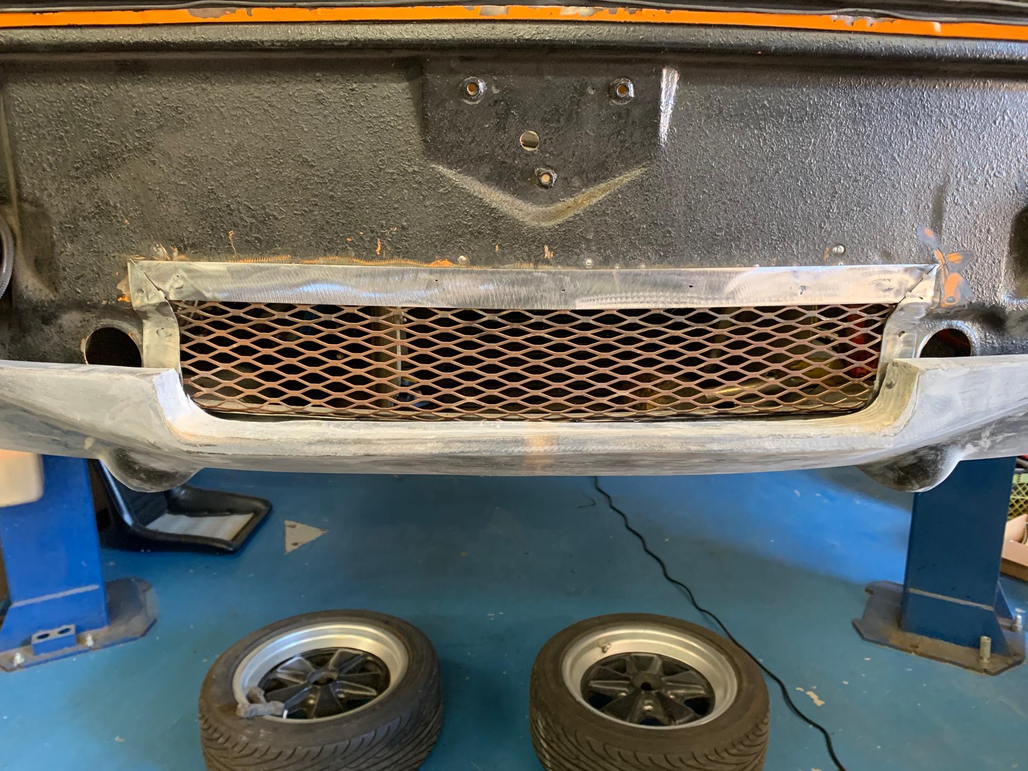 Looking good. Is your metal guy blending the ends of the valance to the flares? @mepstein - That's right. It seemed to me that, looking at reference photos, most are either 'flush' or there is about an 1/8" offset between the wheel-well and the front of valence. I'm good with either, though I thought this looks better. I figure if I ever want that offset, I can add a spacer on the front and 'boom'. Still out of state, but heading home from the customers site my Father sent me a few photos of both the front bumper and valence in primer, as well as the 'Frame' we added around the mesh for the oil cooler to reinforce the structure. Not much left to do here except for finishing, painting, and touching up the rubberized undercoating on the front bumper-area and the back of the bumper! (IMG:style_emoticons/default/aktion035.gif) |