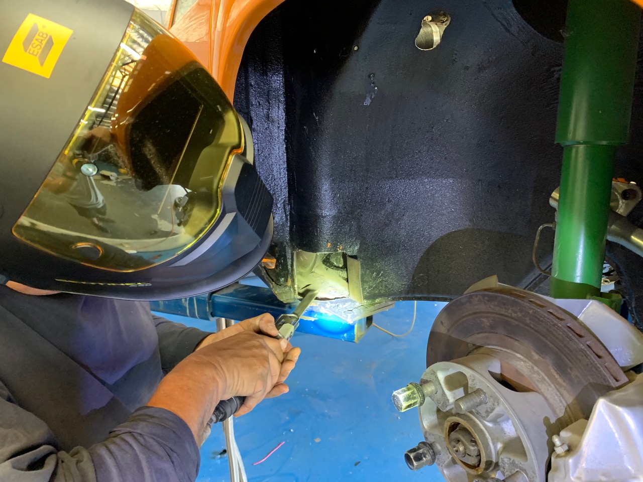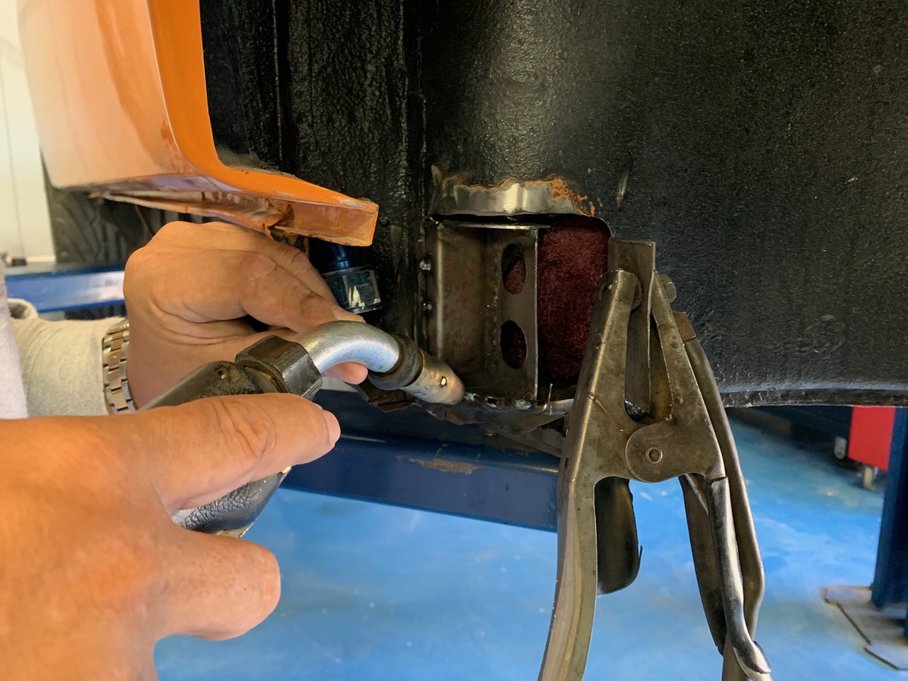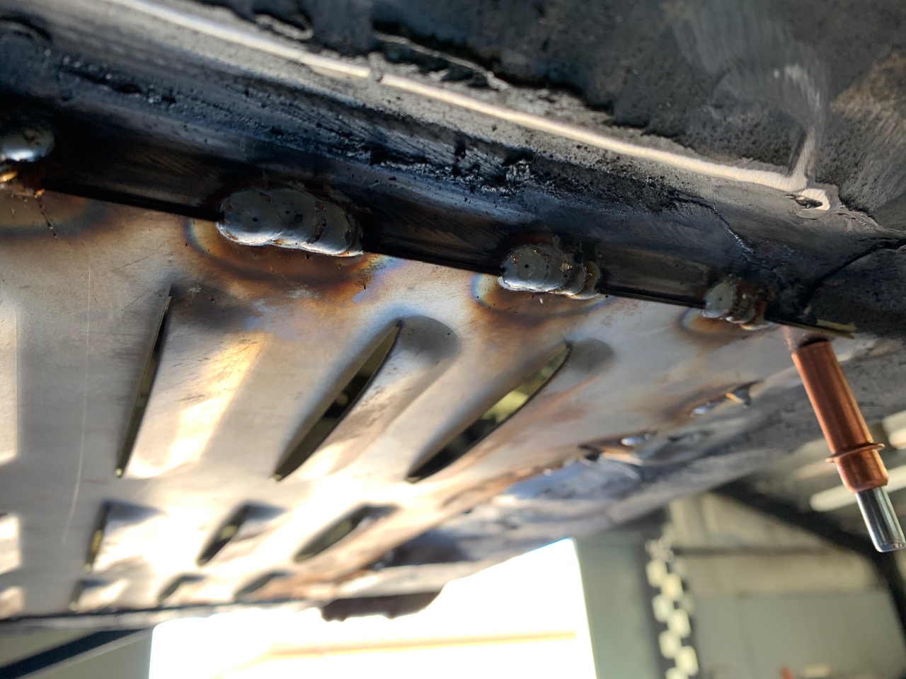 Note to anyone reading this with the same plans: The sheet metal from PMS comes in very long, so you could conceivably just cut out the bottom of the front trunk and stitch weld, but I wanted to keep some fo the factory form (folds in the floor).For my car, I first 'stitched' the bottom, then switched to the top and 'stitched' the spaced in-between. |